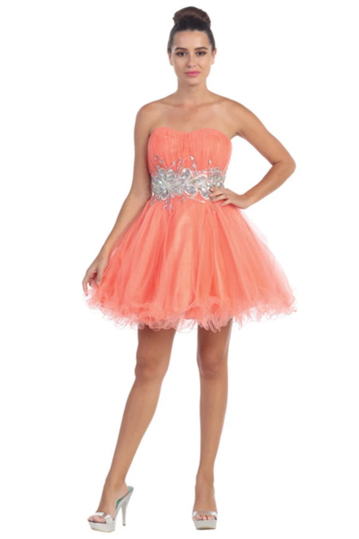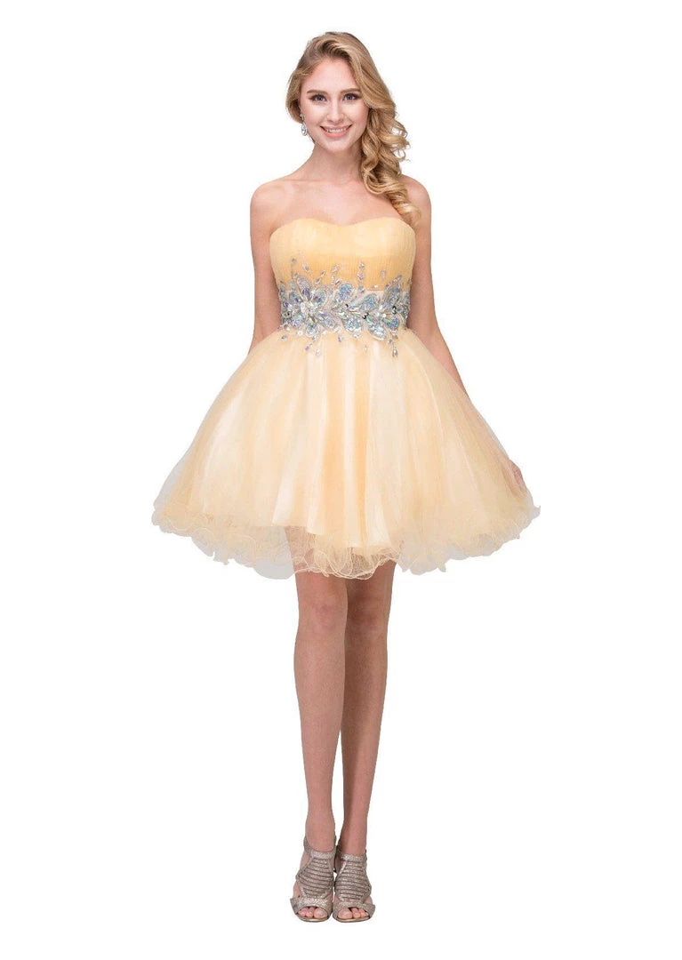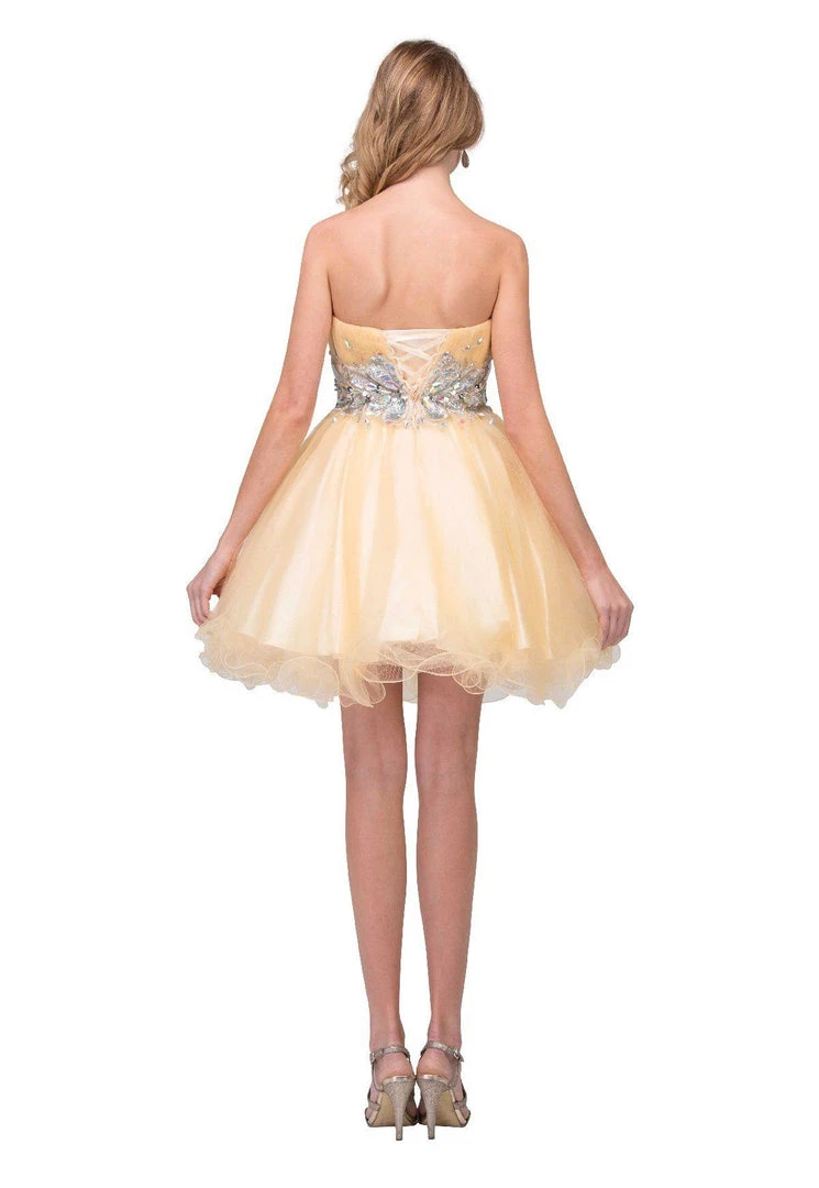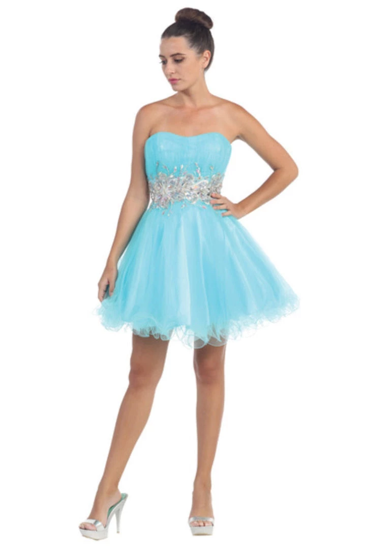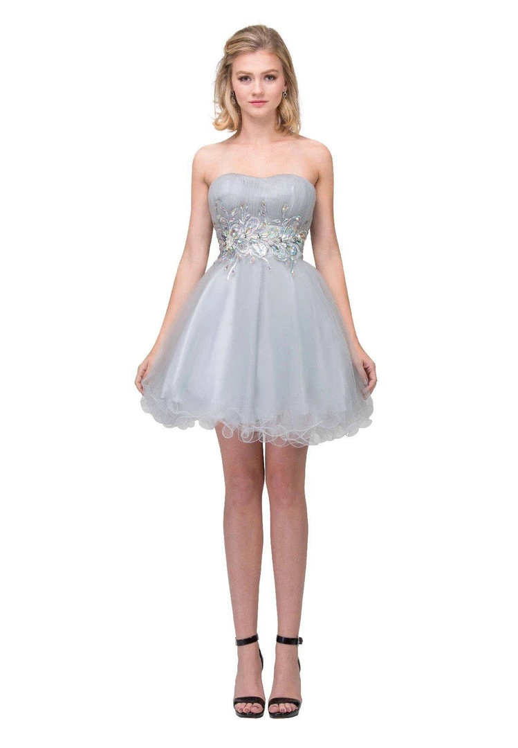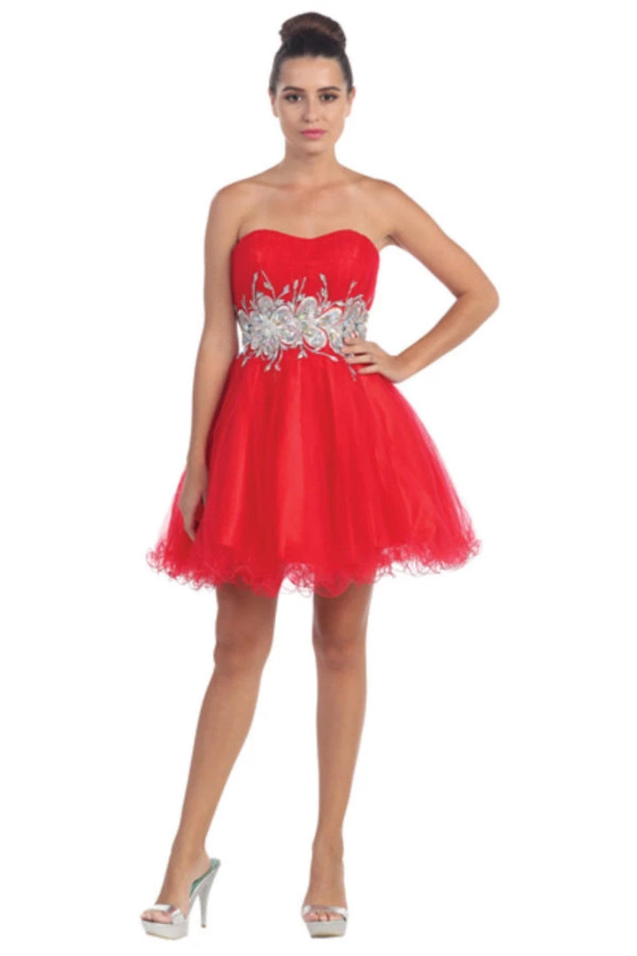 Look unforgettable in this beaded strapless cocktail dress with corset back by Star Box 6057. This beautiful short dress features a straight across strapless bodice embellished with sparkly rhinestones, poofy short ruffled skirt with a curly hemline, and a lace-up corset back with zipper closure. Affordably priced under $150, this short party dress is perfect for any formal event and will keep you on budget!