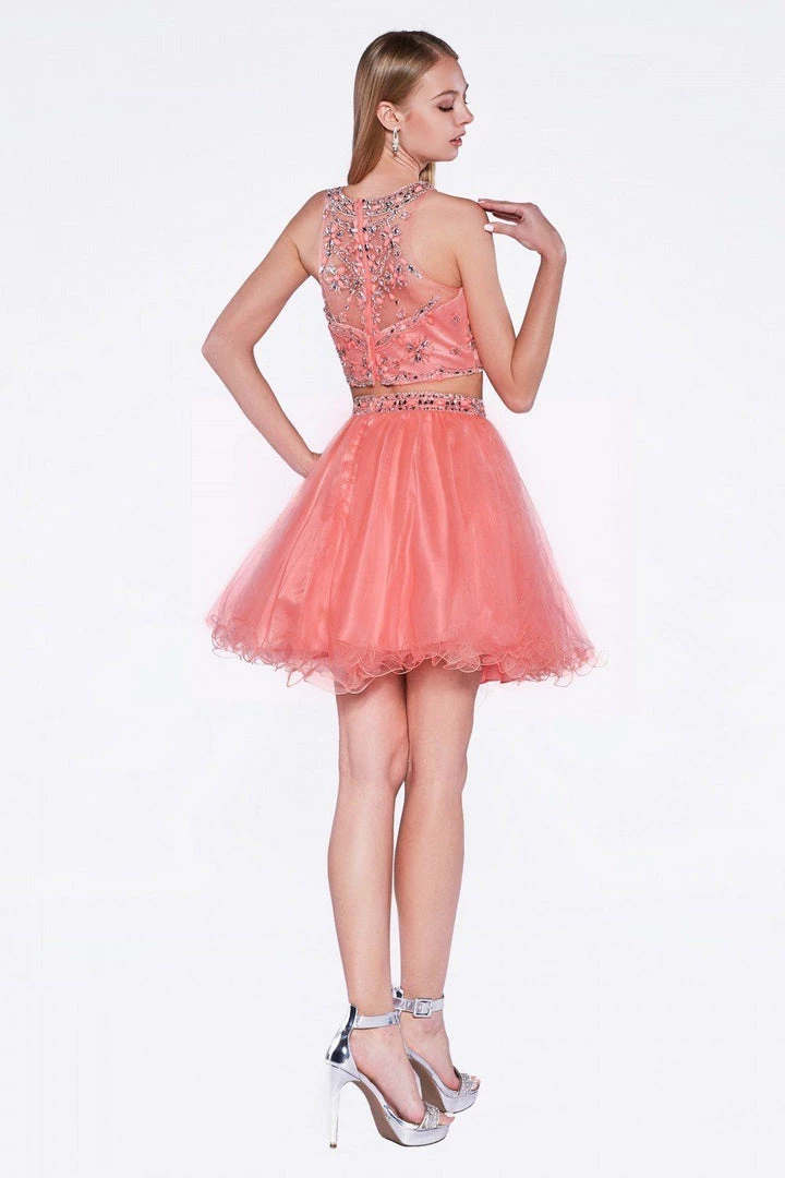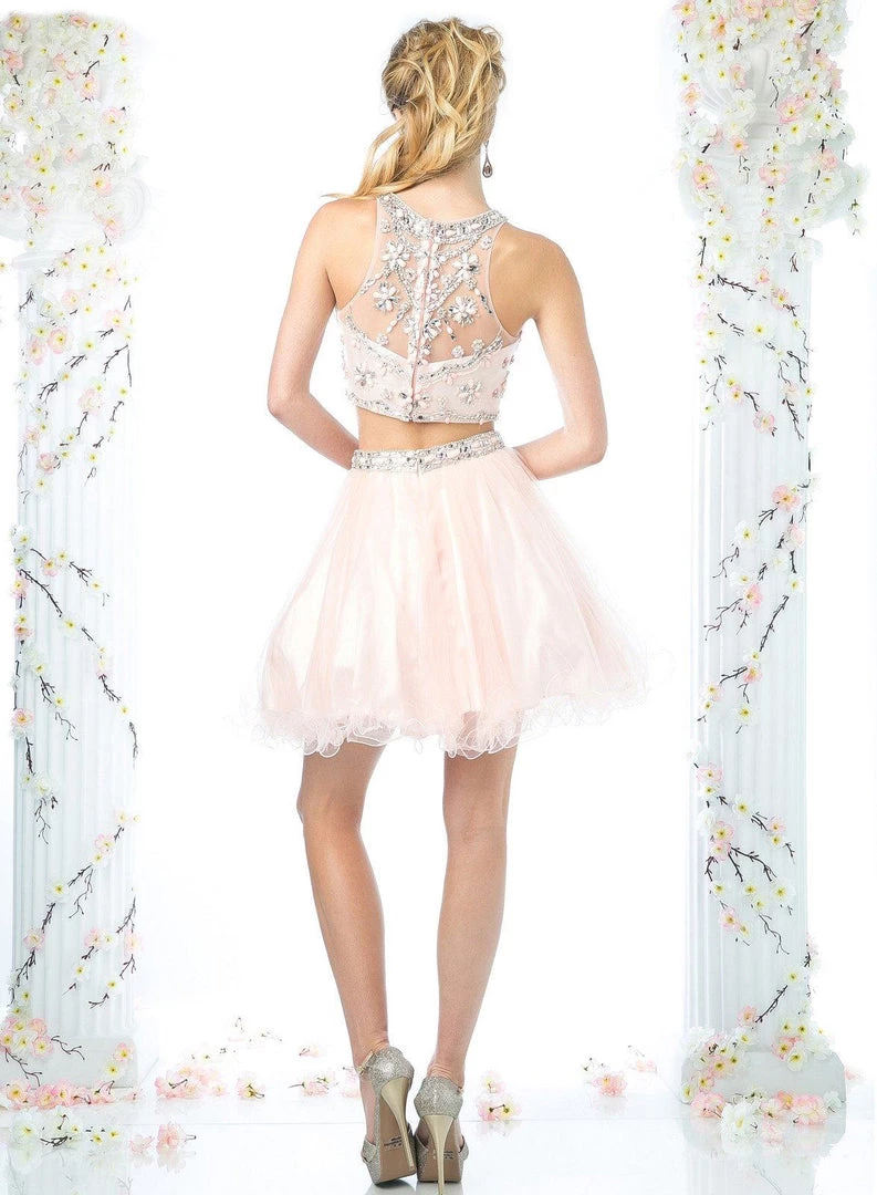 Turn heads in this short two piece beaded cocktail dress by Cinderella Divine 975. Young and modern this two piece is the perfect homecoming or prom dress. The halter top bodice has rhinestone and beading details the sheer bodice and the back. The same beading trim crowns the top of the ruffled tulle skirt that sits above the knee.