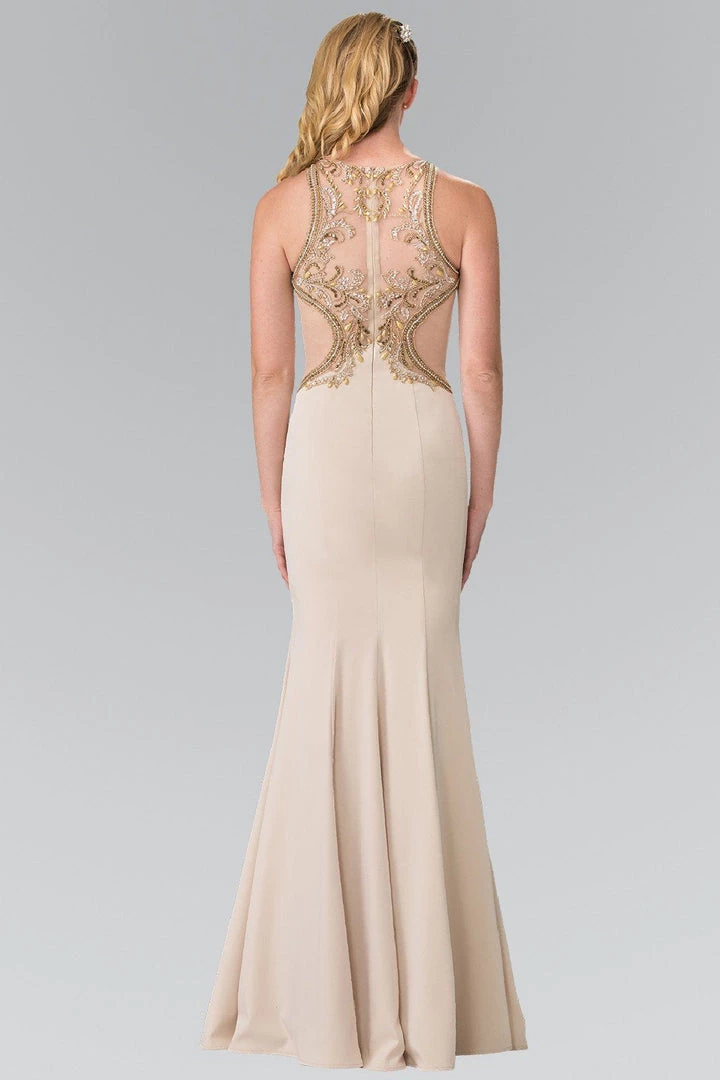 Make a grand entrance in this long beaded sleeveless jersey dress with sheer back by Elizabeth K. Made out of jersey, this beautiful gown features amazing beaded design, sheer embellished neckline, and a beaded sheer back.