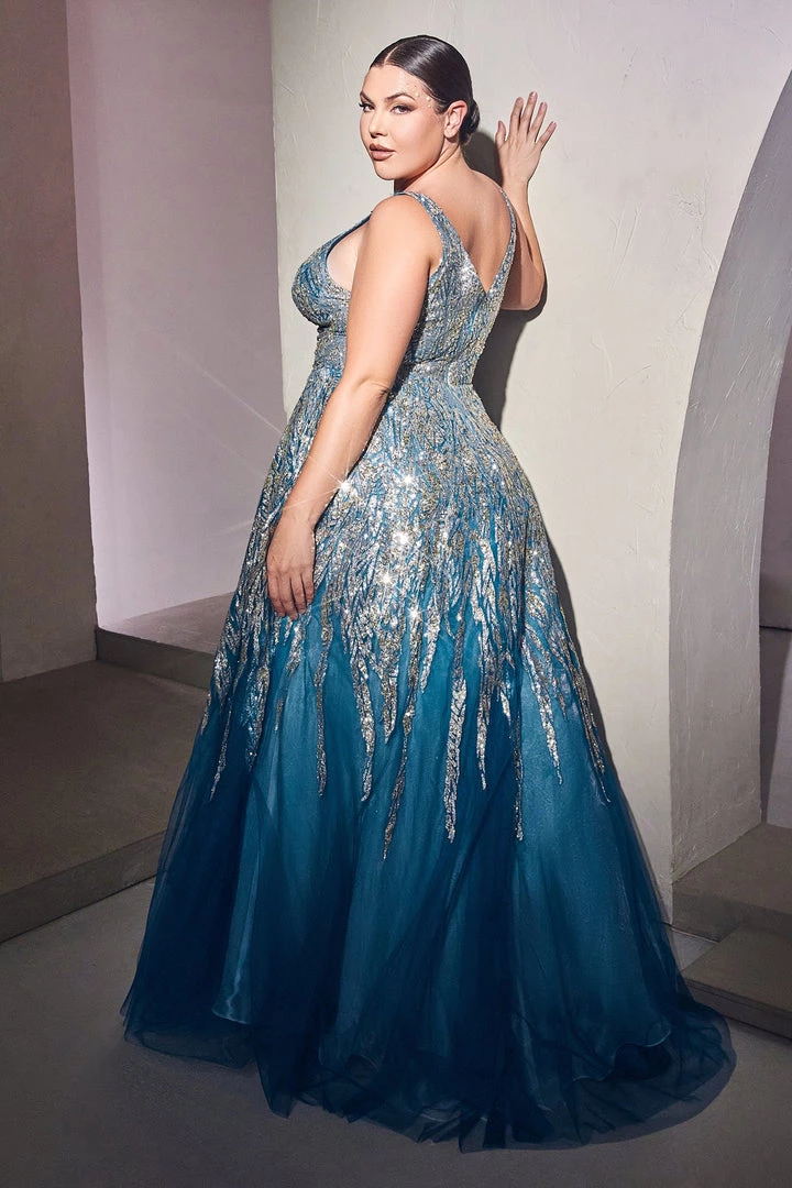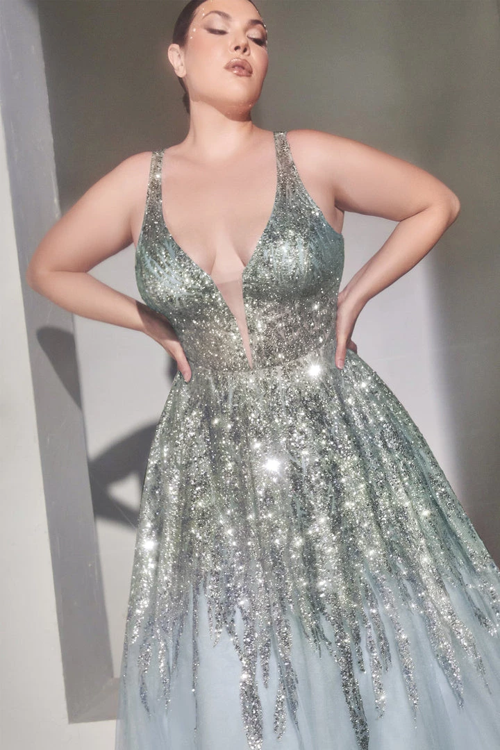Dance the night away in this long sleeveless layered tulle dress with A-line skirt Cinderella Divine C135. Shimmering glitter and bead embellishment adorn this gown from bodice to skirt. Styled with a deep plunging neckline, open back, and illusion cut out sides.