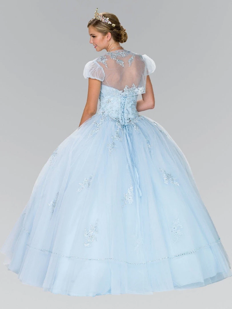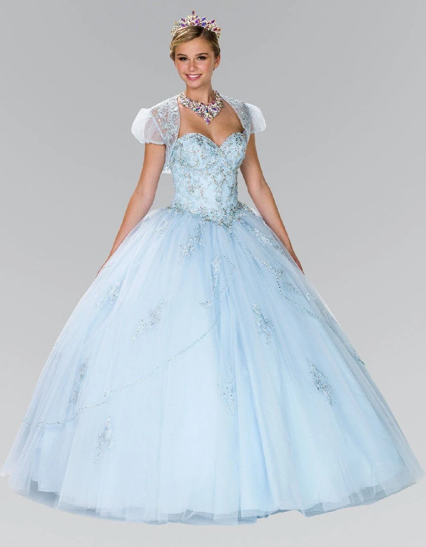 All eyes will be on you in this beaded strapless A-line dress by Elizabeth K Style GL2427. This beautiful gown features a strapless sweetheart neckline, delicate beading is embellished all throughout, long A-line skirt accented with beads, and a lace-up back. This gown comes with a matching bolero jacket.