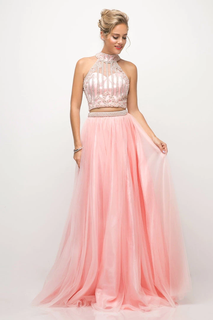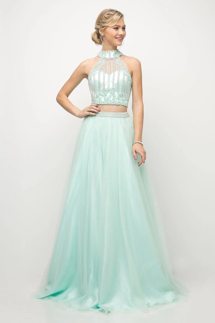 Captivate the room in this beaded two piece crop top A-line dress with high-neck illusion bodice by Cinderella Divine 8994.