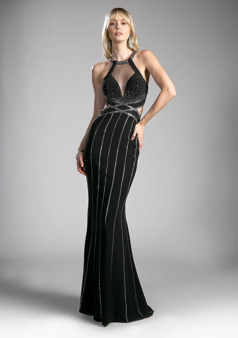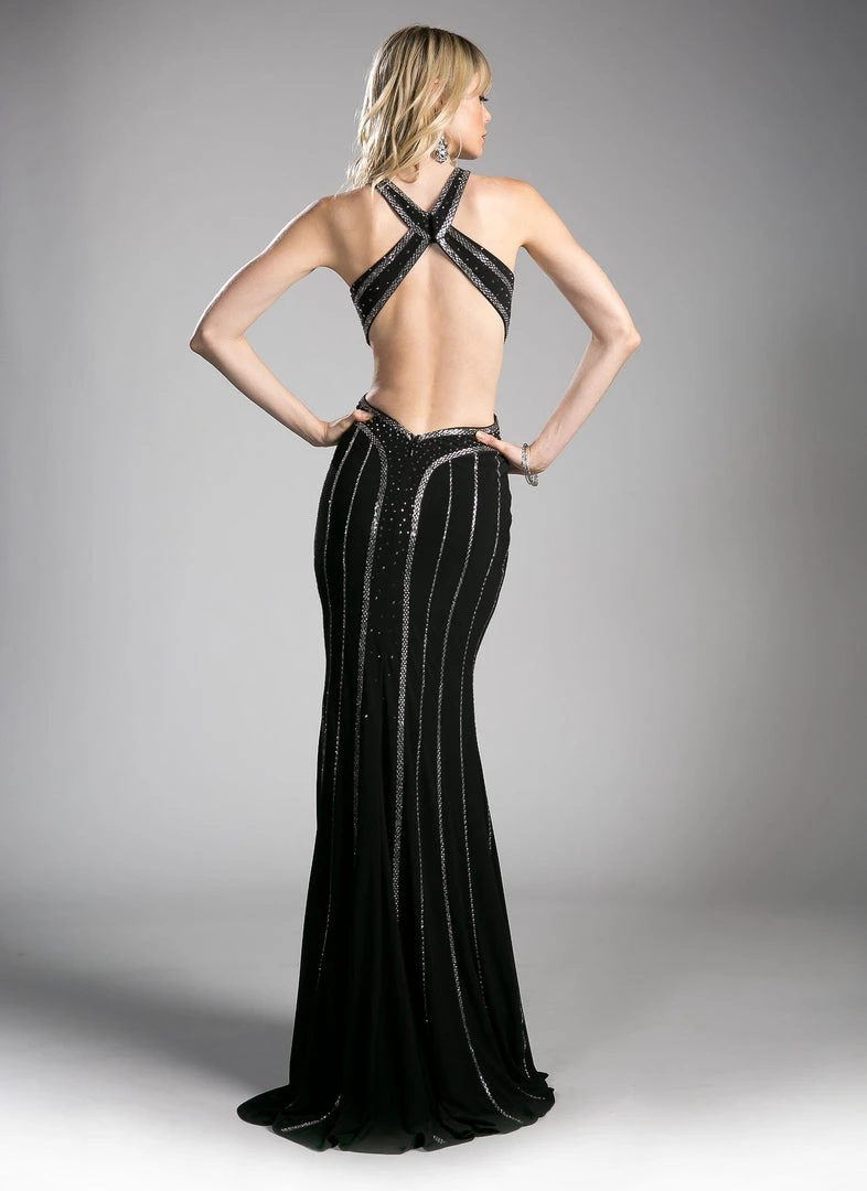 Turn heads in this long black halter dress with open back by Cinderella Divine CD0121. This evening gown features a V-neck halter bodice with a sheer illusion neckline, beaded neckline, this dress is adorned with sparkly rows of sequins and beaded embellishments, a flirty cut out open back with beaded crisscross straps, floor length column skirt, and a zipper closure.