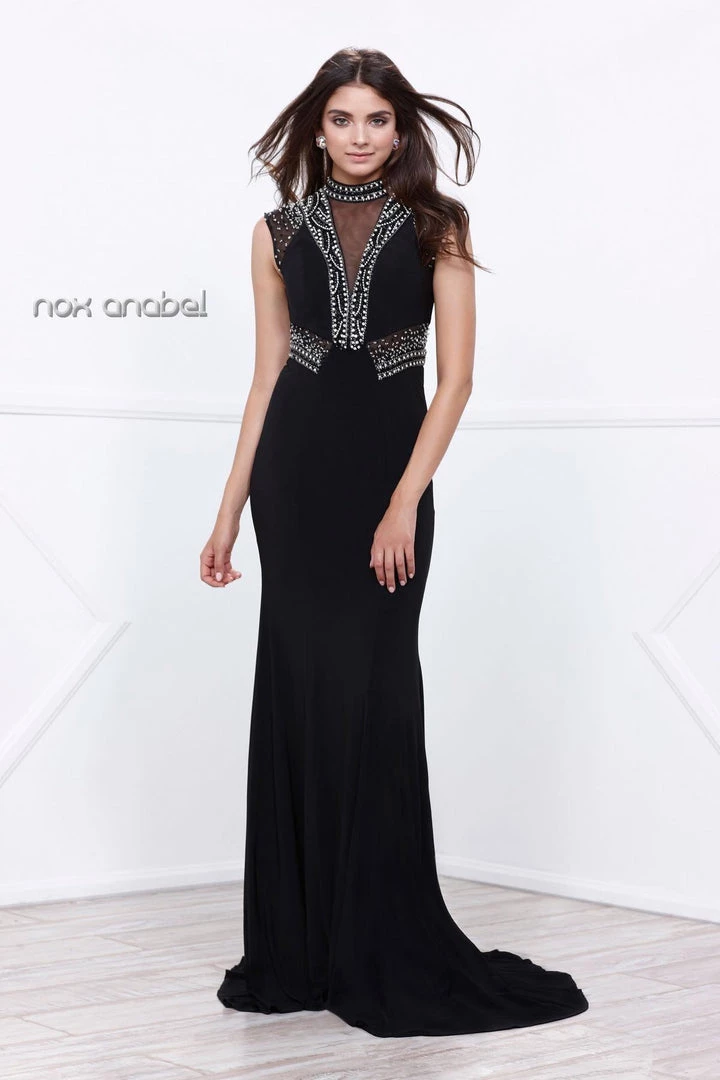 Make lasting memories in this black sleeveless beaded illusion dress by Nox Anabel 8285. This long evening gown features a sleeveless high-neck illusion bodice adorned with a lovely beaded design, the sheer enclosed back is embellished with beads, the floor length mermaid skirt ends in a sweep train, and a zipper closure.