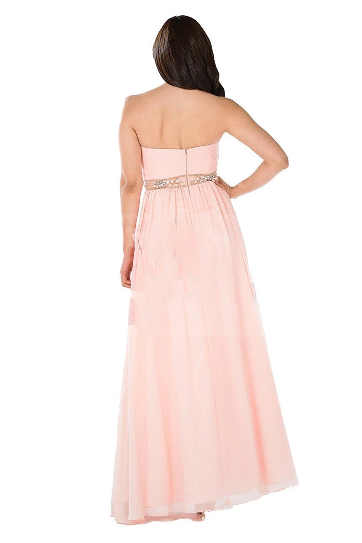 Look radiant in this black strapless A-line gown with embellished waistband by Poly USA 7698. This long chiffon evening dress features a straight across strapless bodice adorned with dazzling rhinestones along the waist. An embellished open back, flowing full-length skirt, and a zipper closure complete this beautiful look. Affordably priced under $200, this dress is perfect for any formal event and will keep you on budget!
