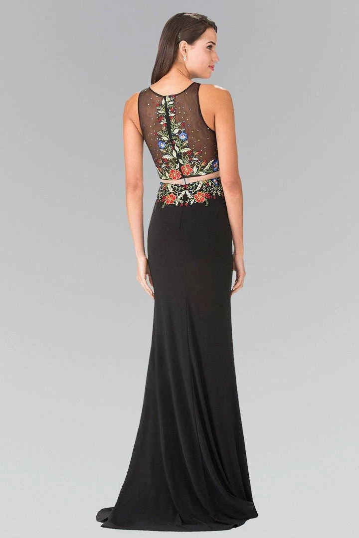 Dazzle the room in this black mock two piece long dress with floral embroidery by Elizabeth K.