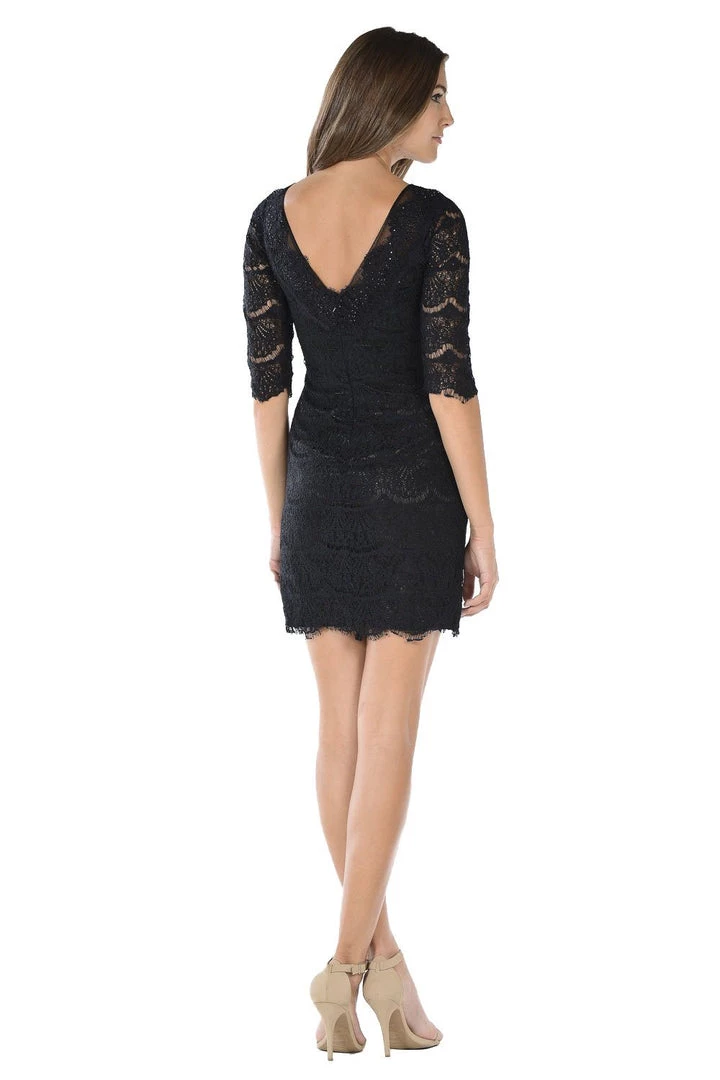 Look flirty and unforgettable in this short black bodycon lace dress with lace mid-sleeves by Poly USA 7654. This lace cocktail dress features a mid-sleeved bodice that is sprinkled with stones for a touch of sparkle. A open V-back, a short above the knee skirt, and a zipper closure complete this beautiful look. Affordably priced at $125, this dress is perfect for any formal event and will keep you on budget!