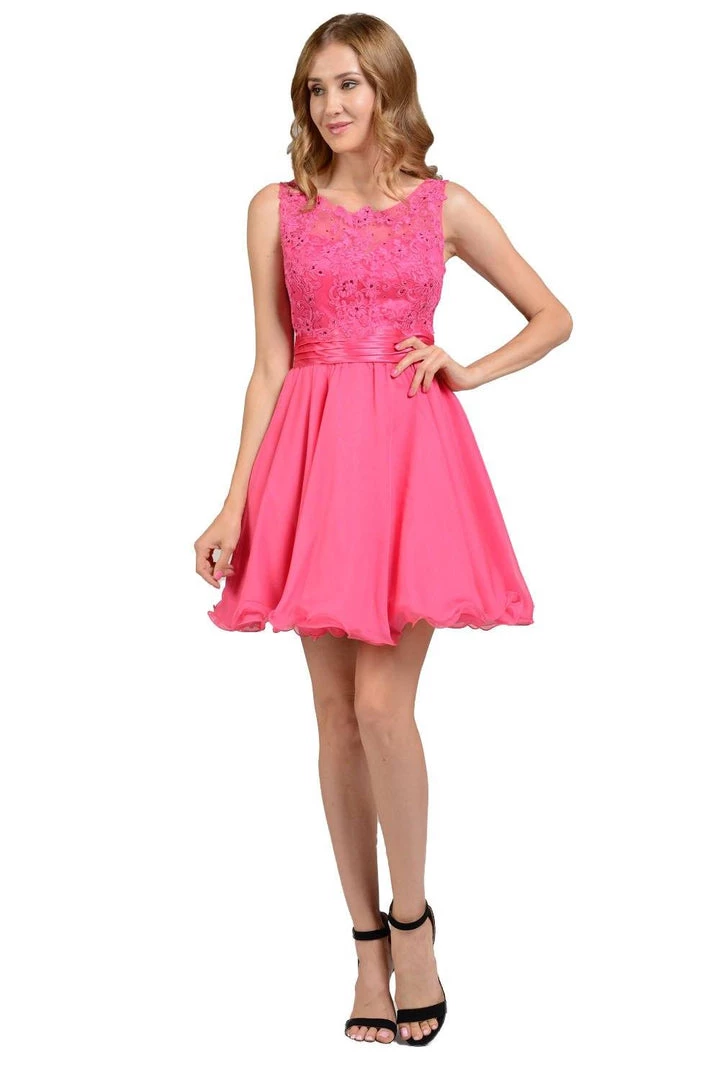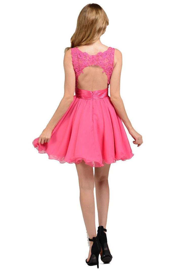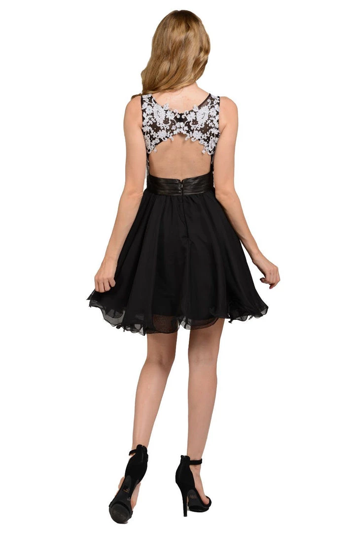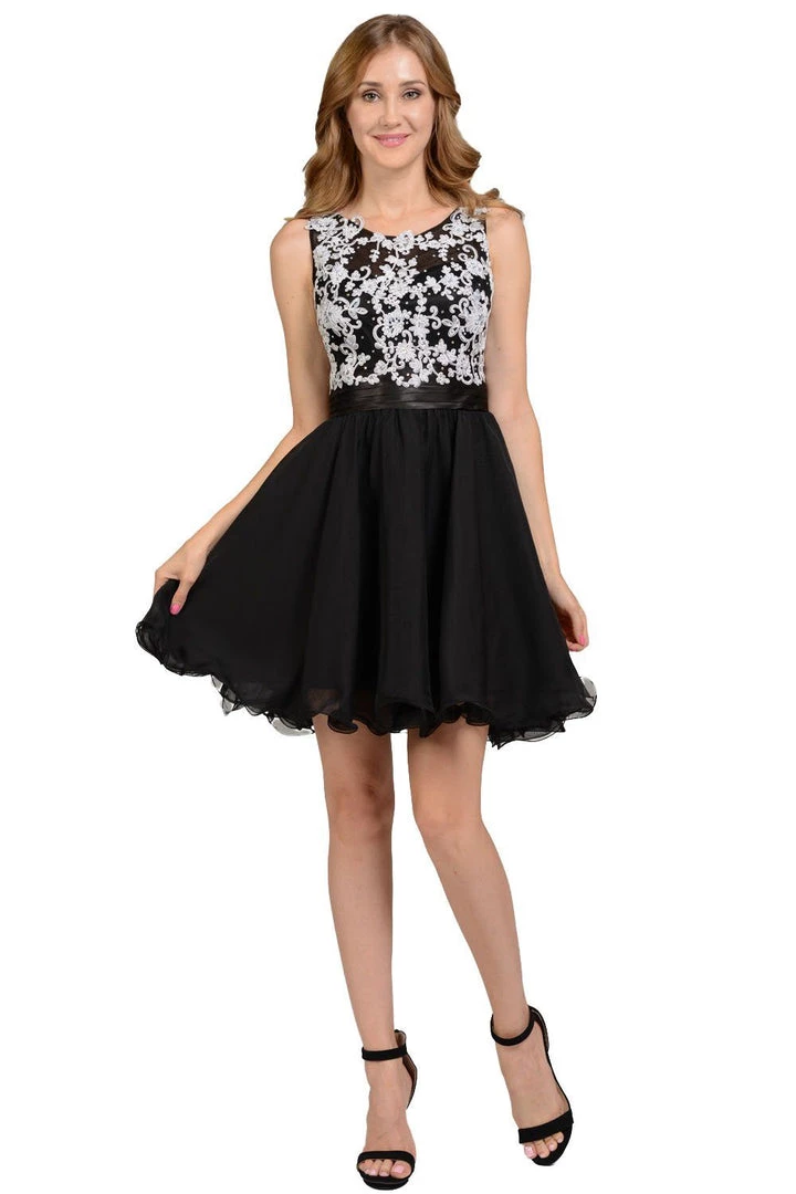 Feel like a Princess in this short black chiffon dress with white lace appliqued bodice by Poly USA Style Number 7064. This sleeveless dress features an illusion neckline while the bodice is embellished with lace appliques accented with stones. A flirty back cutout, a short hem rolled A-line skirt, and a zip closure complete this beautiful look. Perfect for any semi-formal event!