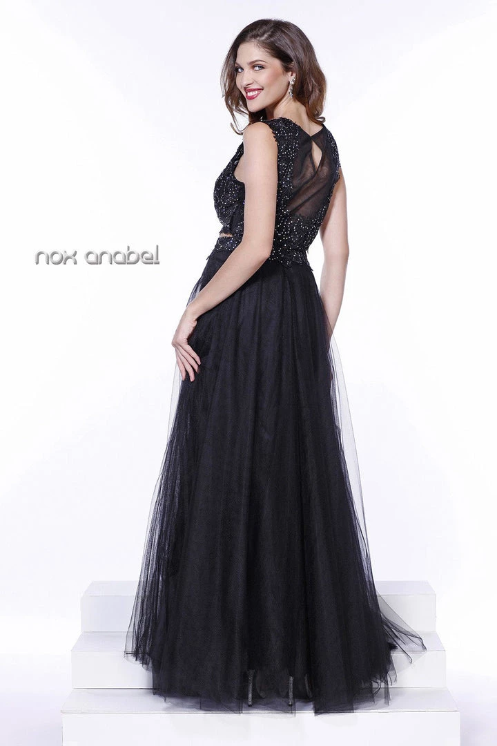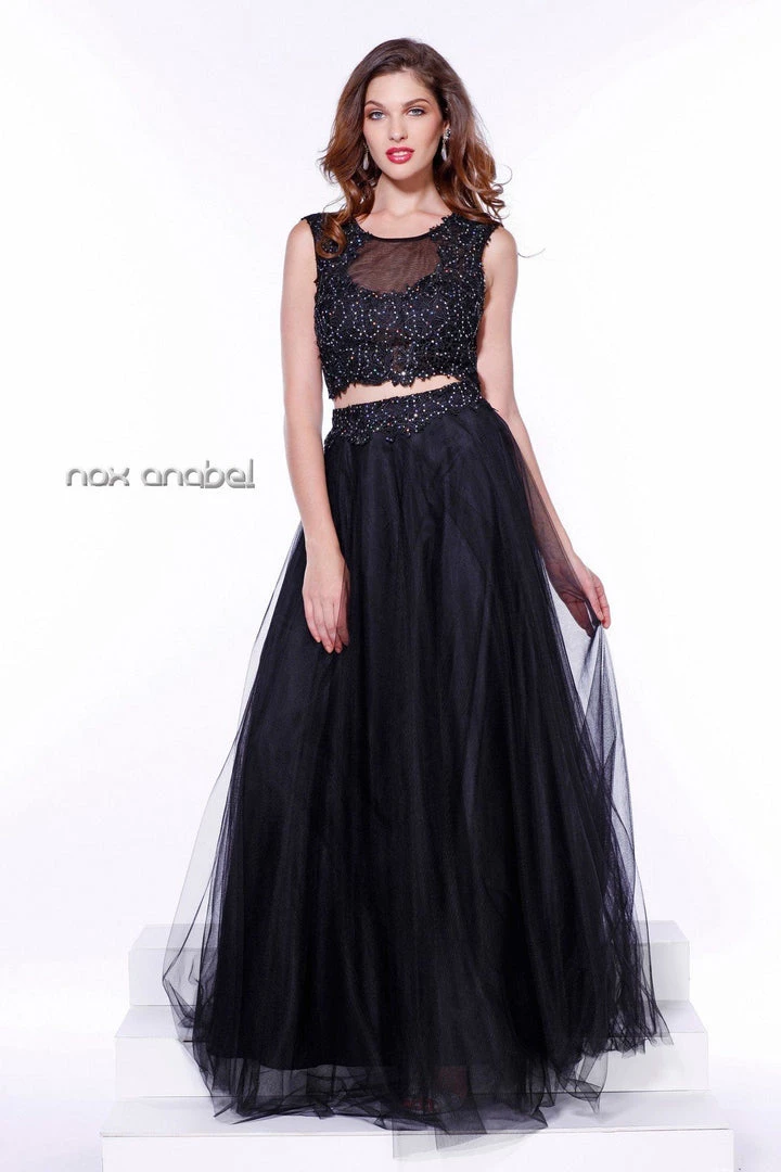 Radiate the room wearing this black two-piece crop top lace illusion dress by Nox Anabel Style Number 3136 at your upcoming formal event. This long evening gown features a sleeveless lace crop-top with sheer illusion neckline, the long skirt elegantly moves as you dance the night away, small keyhole back, and a zipper closure.