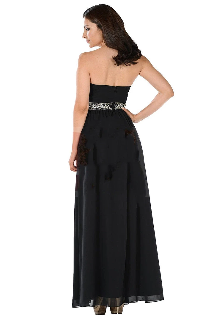 Look radiant in this royal blue strapless A-line gown with embellished waistband by Poly USA 7698. This long chiffon evening dress features a straight across strapless bodice adorned with dazzling rhinestones along the waist. An embellished open back, flowing full-length skirt, and a zipper closure complete this beautiful look. Affordably priced under $200, this dress is perfect for any formal event and will keep you on budget!
