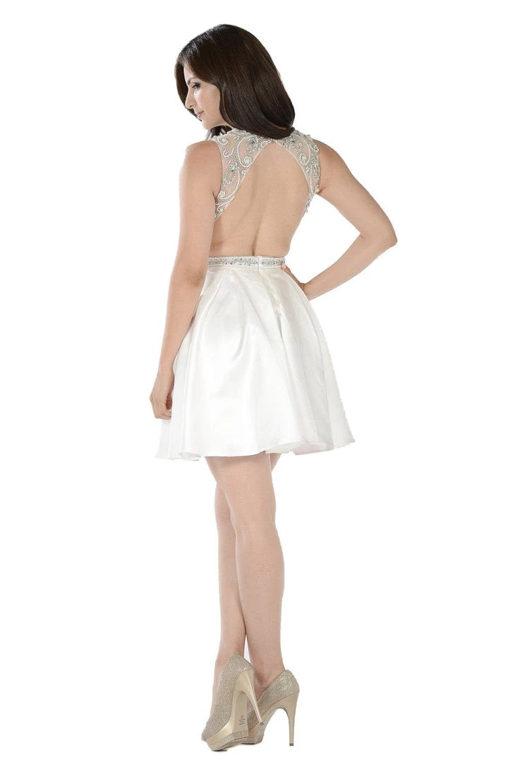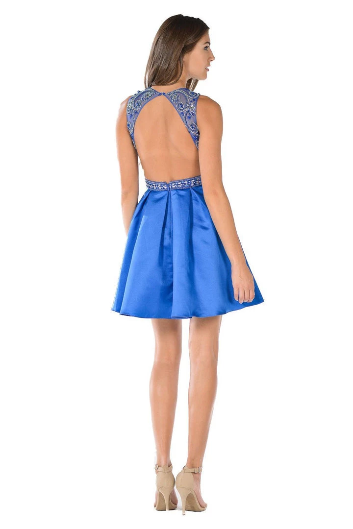Look stunning in this short blue satin dress with beaded bodice by Poly USA 7640. This cocktail dress features a sleeveless bodice embellished with sparkly beads and rhinestones. A flirty open back, a short box pleated skirt, and a zipper closure complete this beautiful look. Affordably priced under $200, this dress is perfect for any formal event and will keep you on budget!