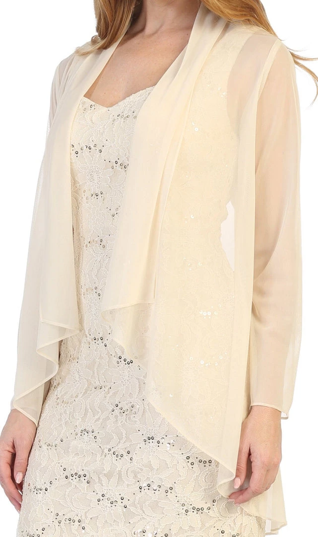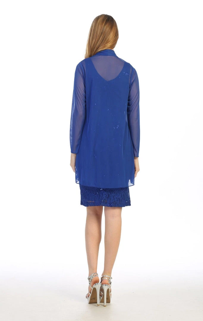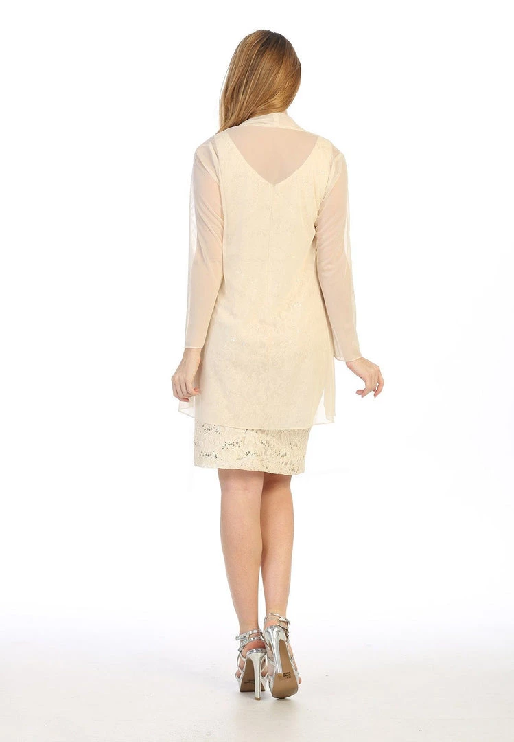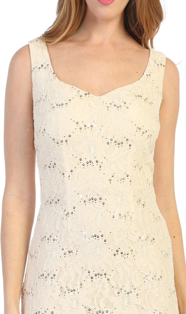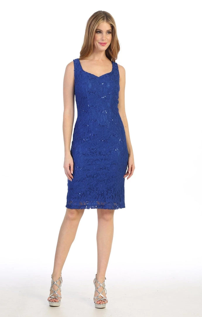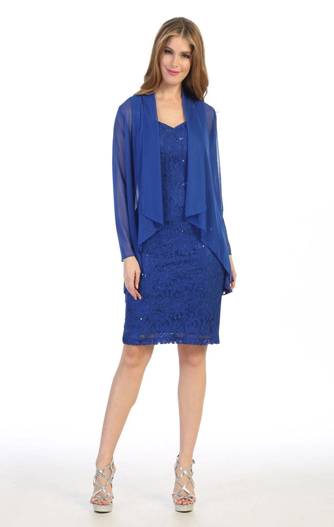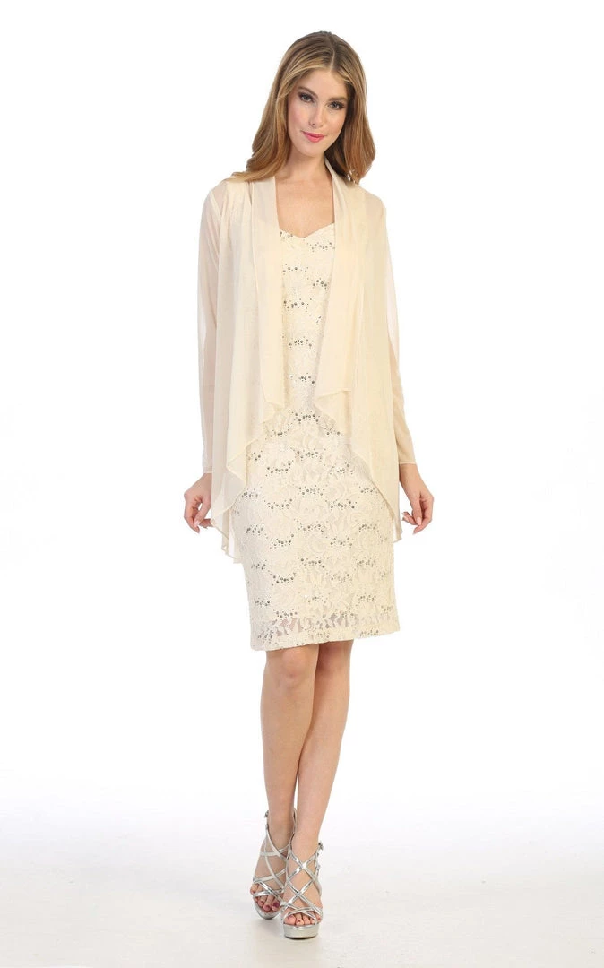 Look unforgettable in this fitted sequined lace cocktail dress with cardigan by Celavie 6431. This beautiful short sequin lace dress features a sleeveless scoop bodice, a removable sheer cardigan, partial open V-back, short knee length form fitting skirt, and a zipper closure. Affordably priced at $120, this short party dress is perfect for any formal event and will keep you on budget!