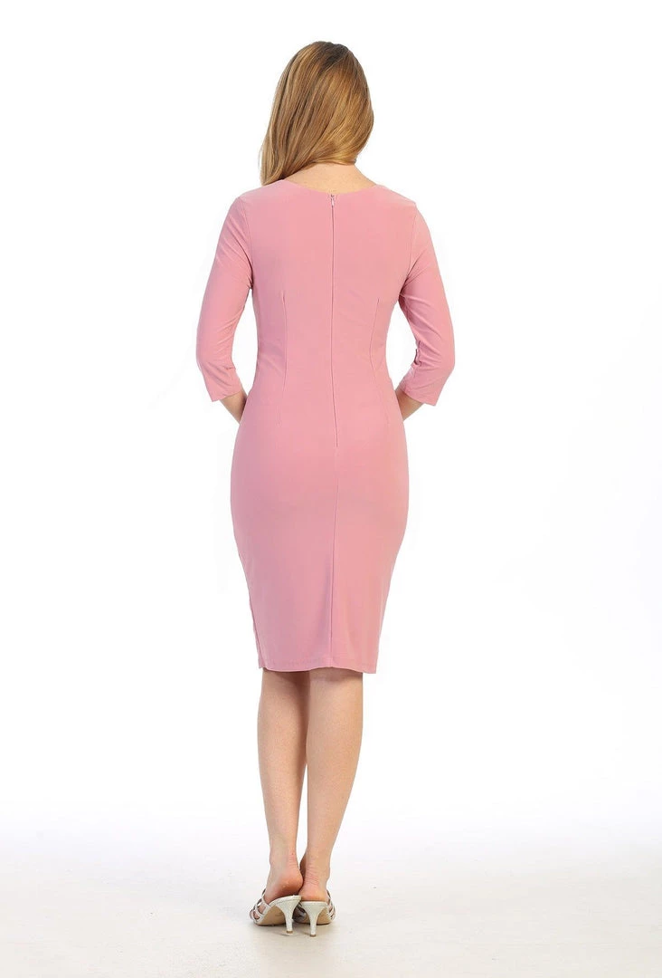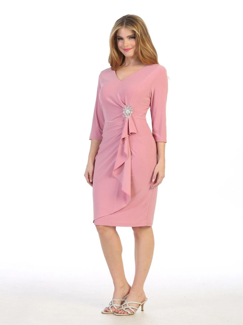 Look modest chic in this V-neck cocktail dress with mid-length sleeves by Celavie 6412. This beautiful knee length dress features a V-neck bodice, elbow length sleeves, bead embellished brooch, modest open V-back, short fitted skirt that gracefully falls to the knees, and a zipper closure. Affordably priced at $99, this short party dress is perfect for any formal event and will keep you on budget!