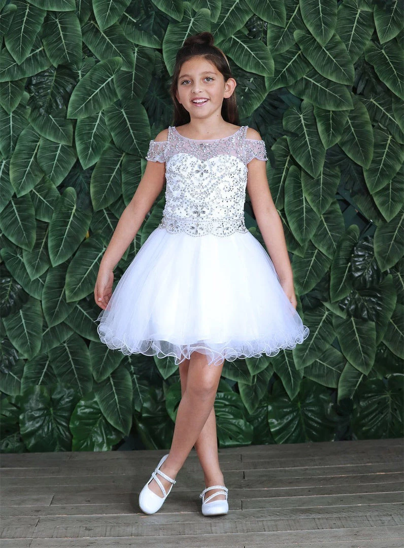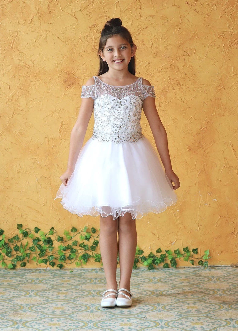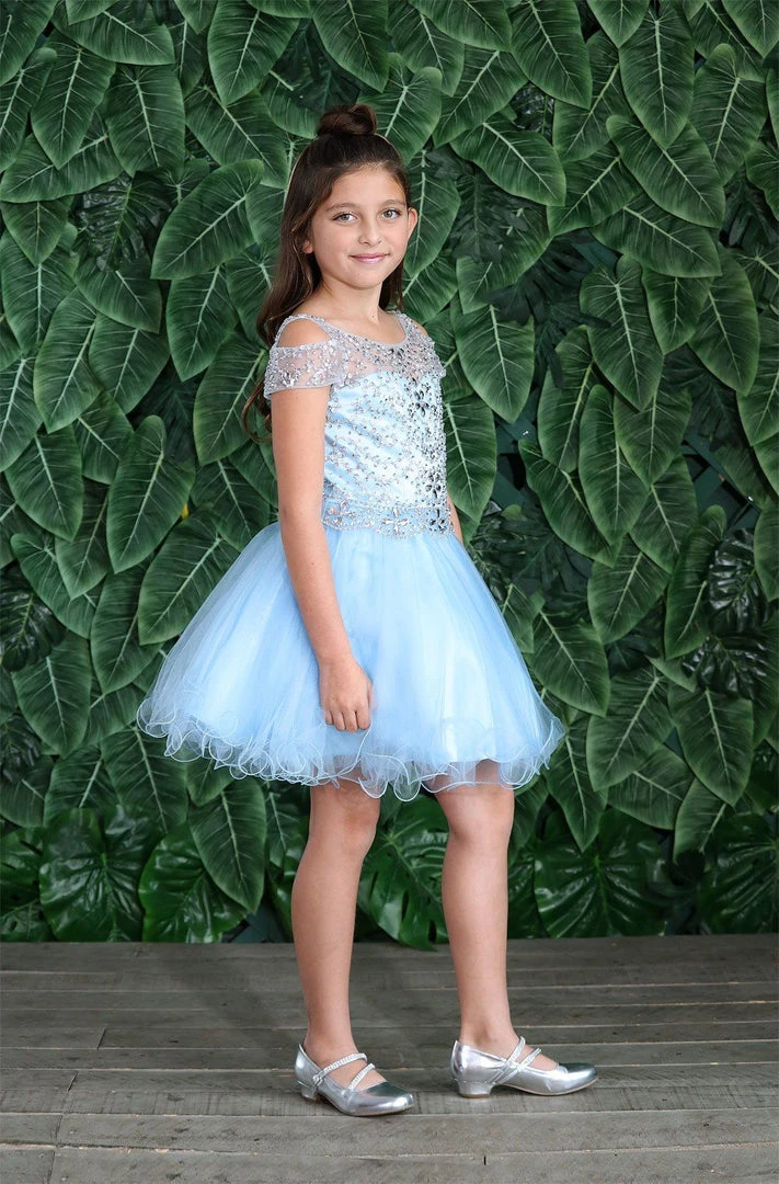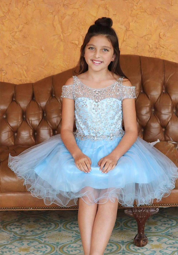 Your lovely tween girl will look receive lots of compliments in this short cold shoulder dress with ruffled skirt by Calla Collection TY012. This dress features a sheer off shoulder bodice embellished with sparkly beads, a short hem rolled A-line skirt with ruffles, partial open back, and a zipper closure.