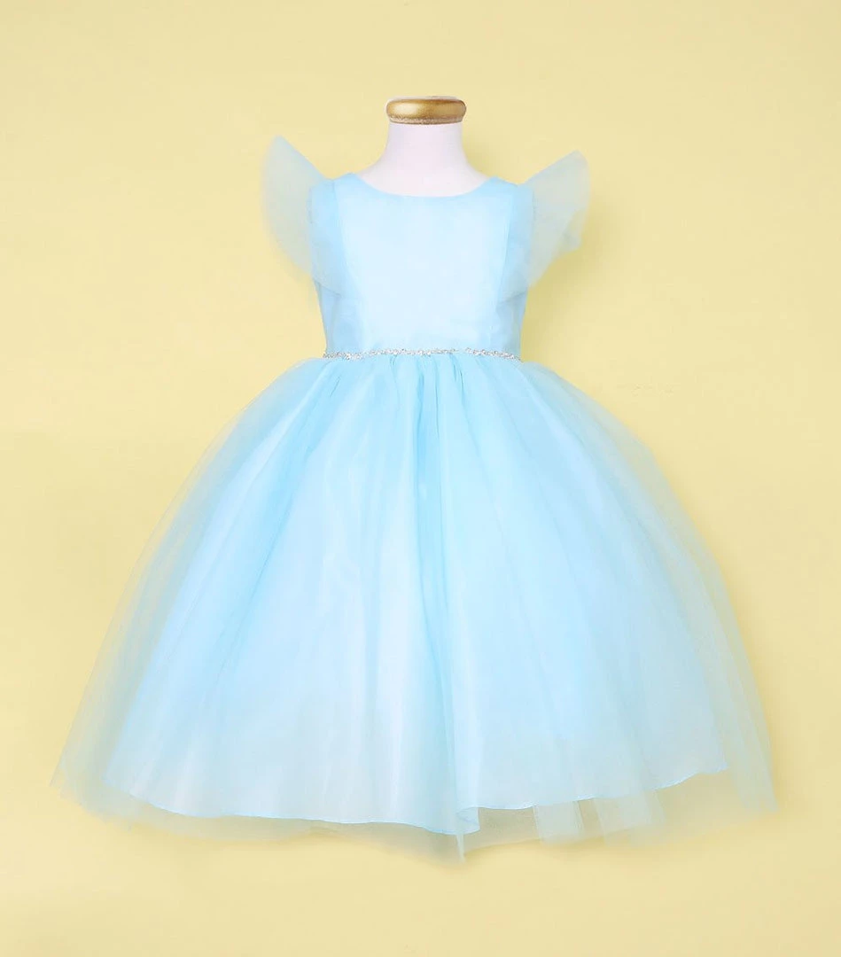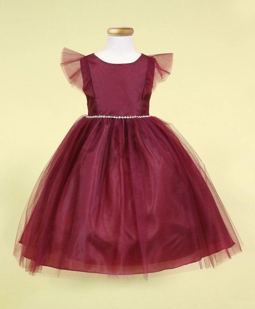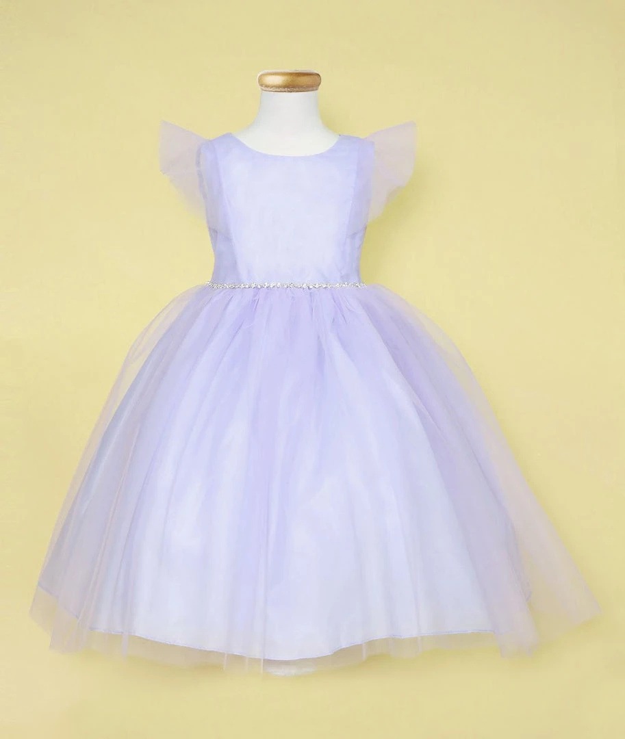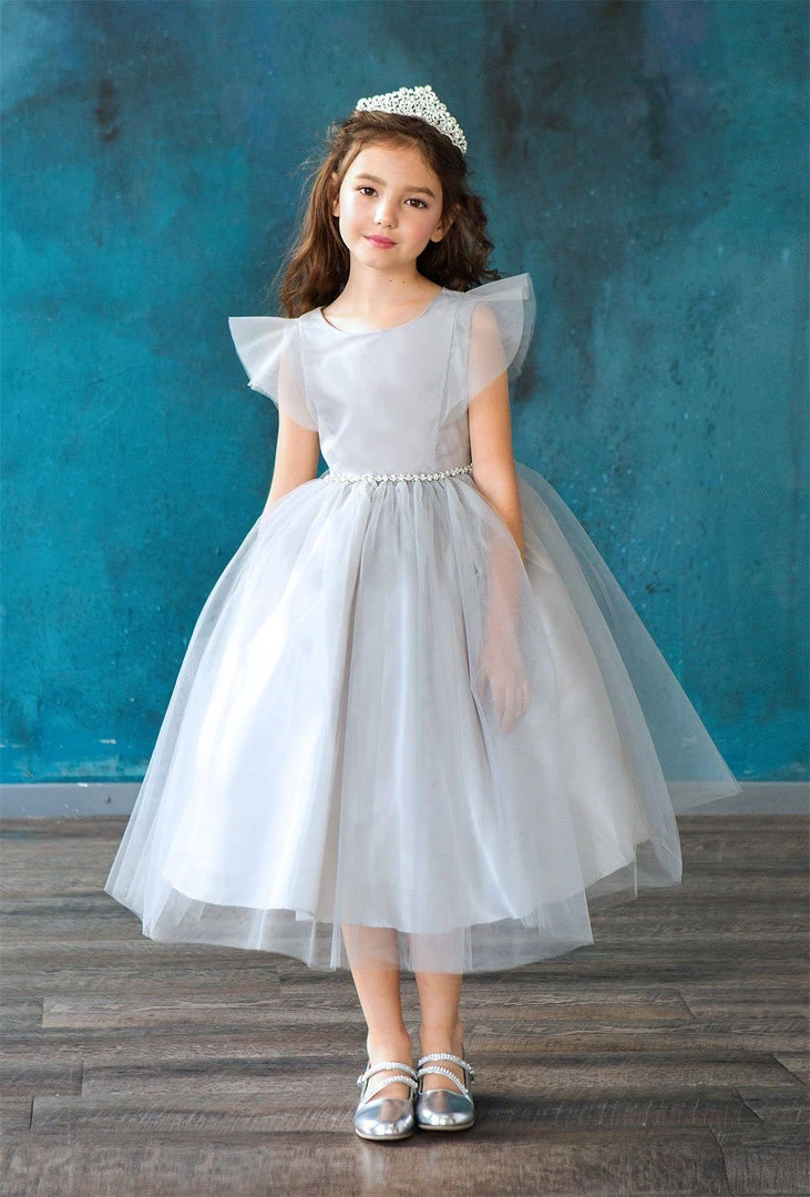 Your sweet girl is sure to receive lots of compliments in this tea length tulle dress with ruffle sleeves by Calla Collection D794. This beautiful gown features a scoop bodice with ruffled short sleeves, the beaded waistband adds a touch of sparkle, tea length tulle A-line skirt, open back with bow sash, and a zipper closure.