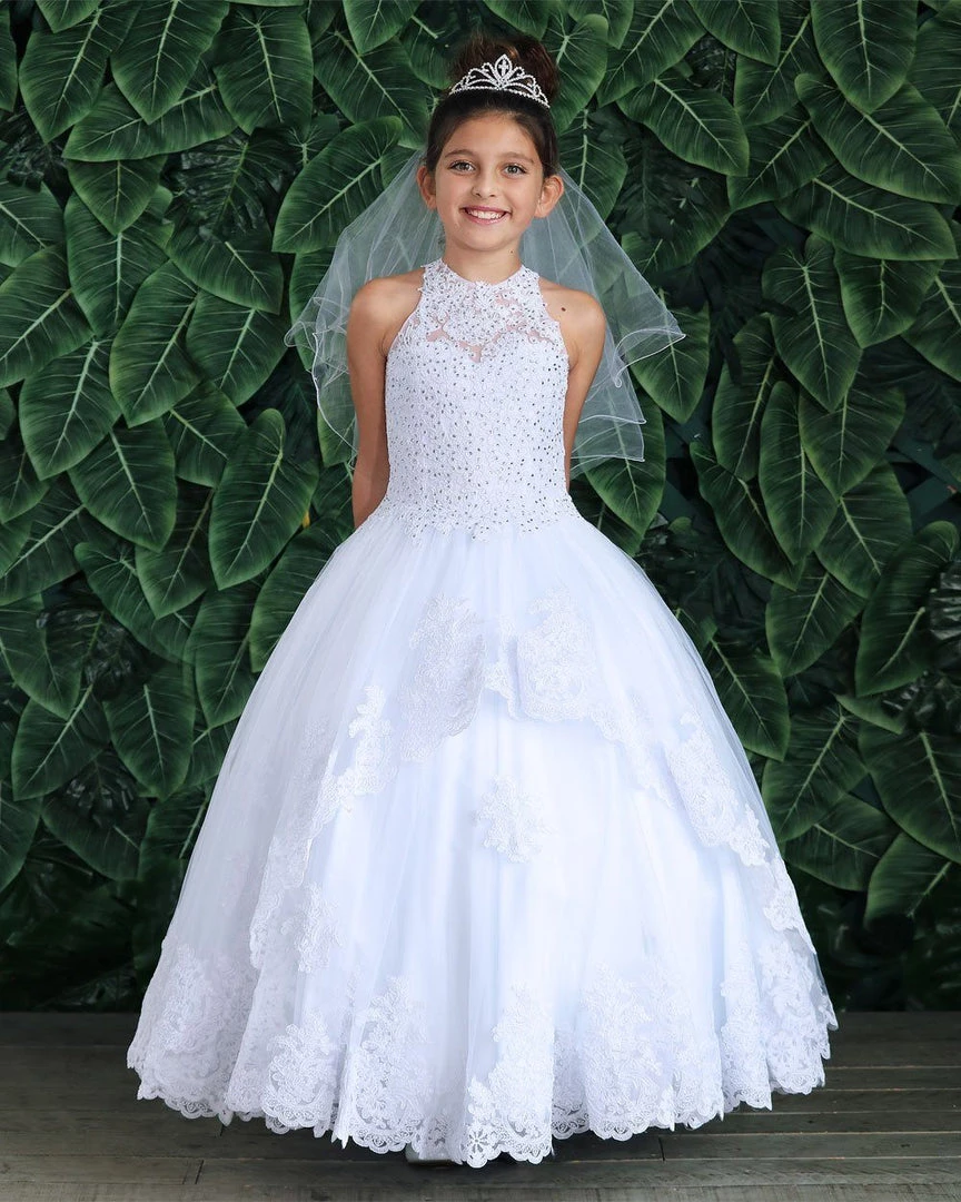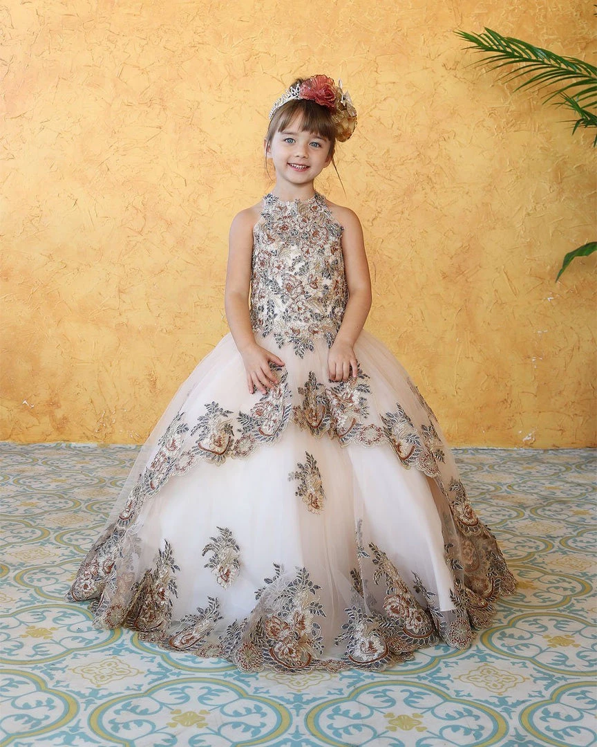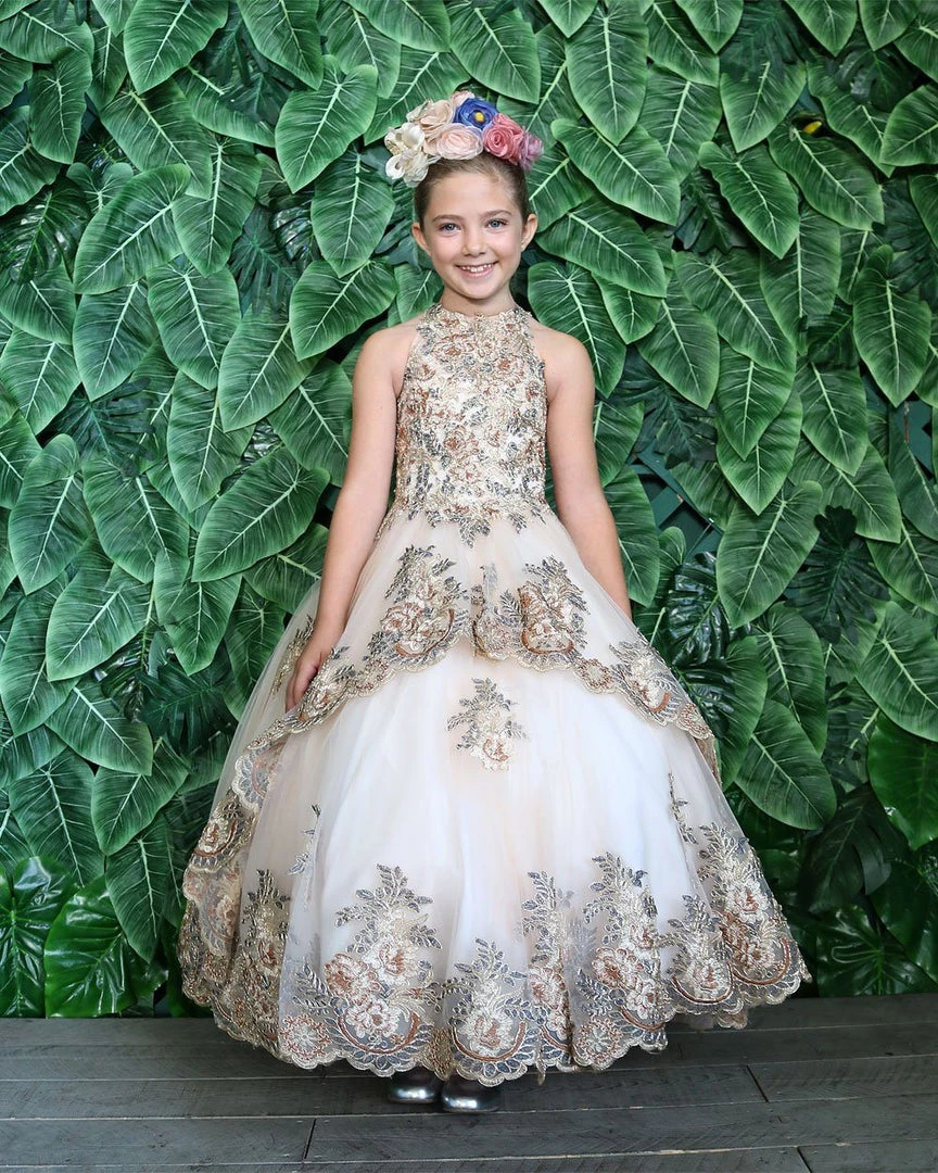 Your sweet girl will take center stage in this long sleeveless dress with multi-color embroidery by Calla Collection KY214. This beautiful ball gown features a high neck sleeveless bodice embroidered with lace appliques accented with beads, partial open back, floor length A-line skirt with appliques, and a lace-up corset back. Available Matching Quinceanera Style KY75258X.