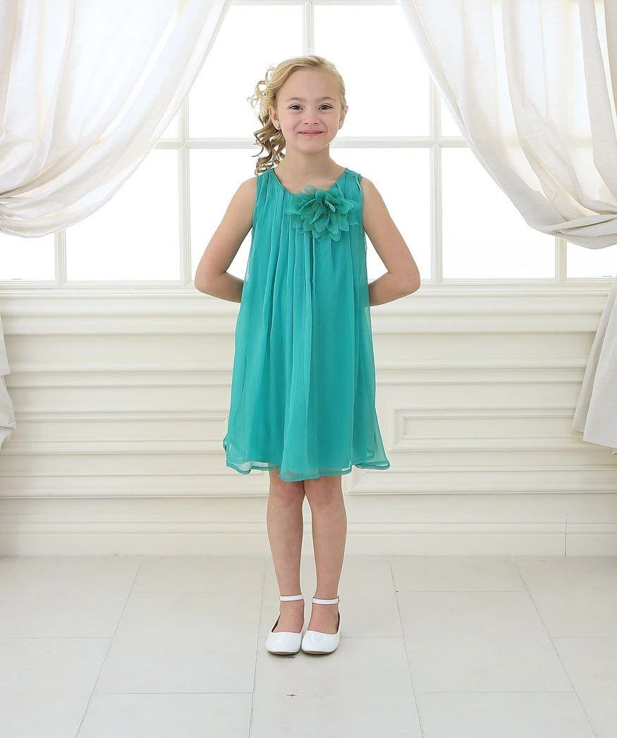 Elegant and beautiful, this girl’s knee length pleated green chiffon dress is a must-have for any occasion. Designed by Calla Collection, this short dress features a sleeveless pleated bodice with a scoop neckline and a zipper back closure.