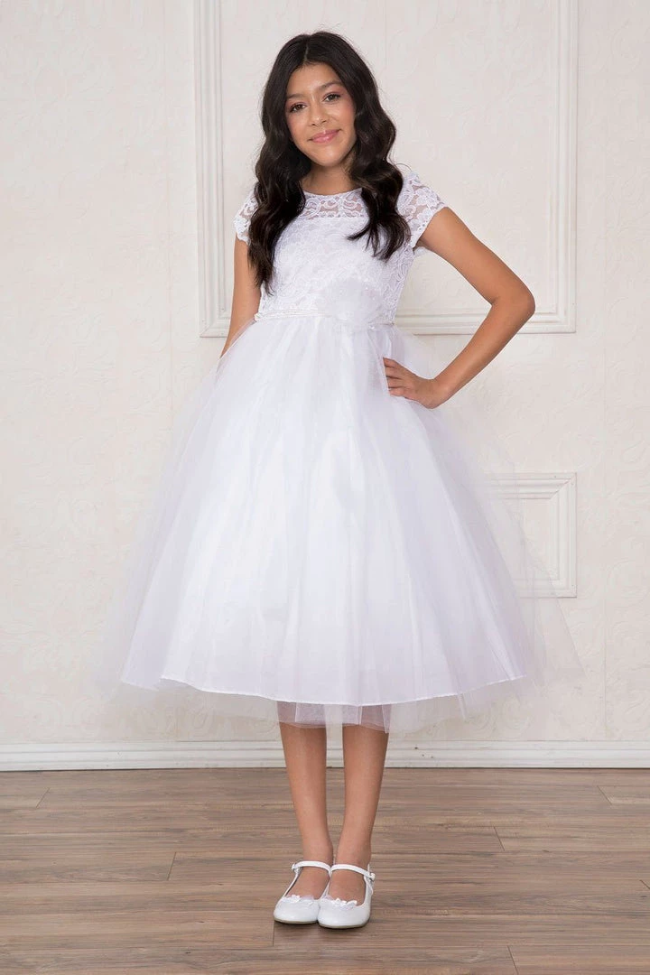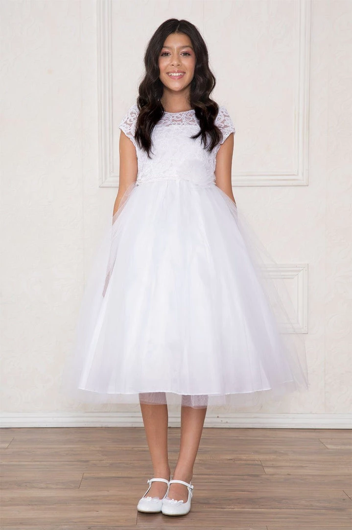 Your little miss will love twirling around in this tea length dress with short-sleeved lace bodice by Calla Collection! This beautiful dress features a short-sleeved lace bodice withĀ three lines of pearl jewel on waistline, a lovely floral embellishment, and a zipper closure. She’ll love wearing this dress during her Tres Anos party, pageant, a wedding, or for any special occasion!