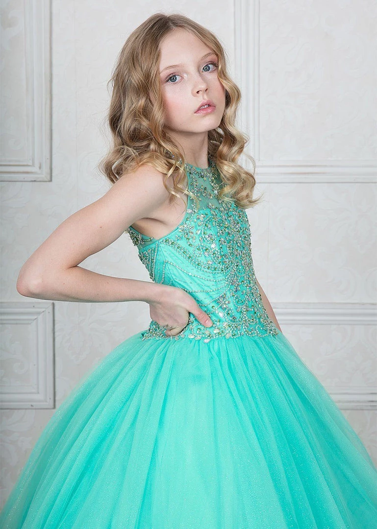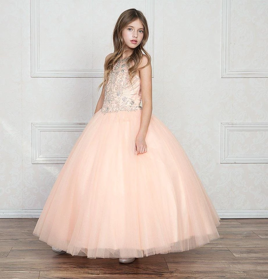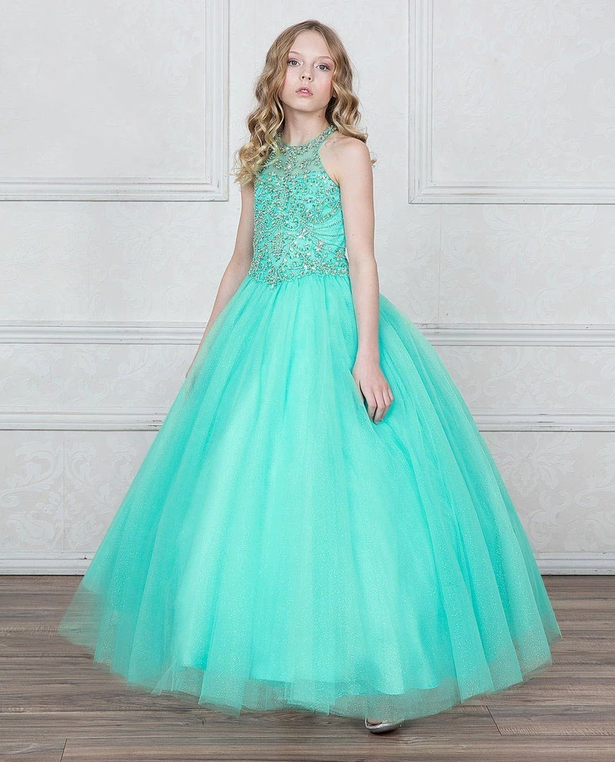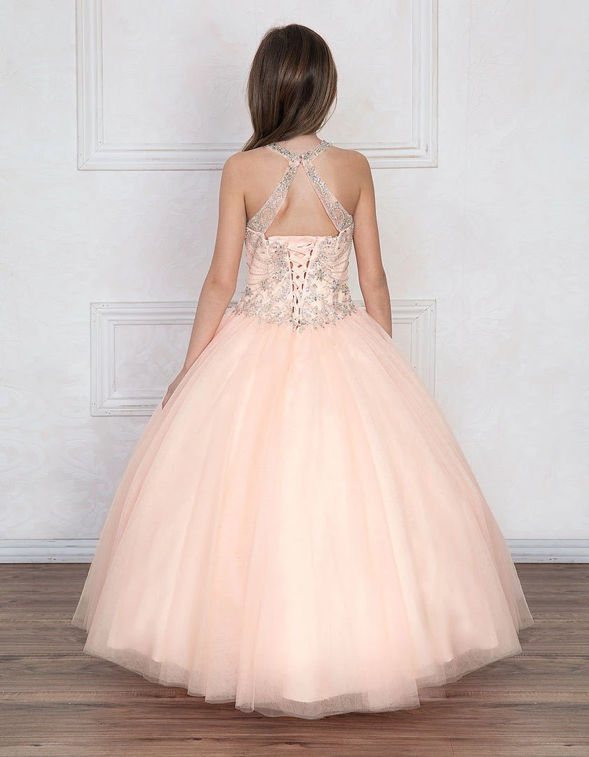 Your sweet girl will light up the room in this beaded long high-neck halter illusion dress with A-line tulle skirt by Calla Collection KY207. This beautiful ball gown features a sheer sweetheart bodice adorned with sparkly beaded embellishments, open back with cutout, floor length A-line skirt, and a lace-up corset back.