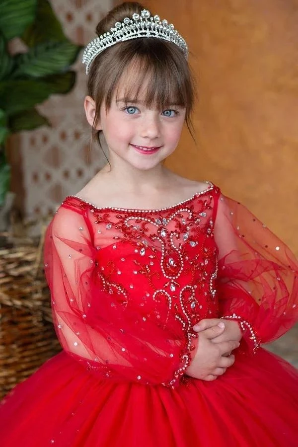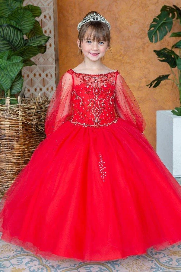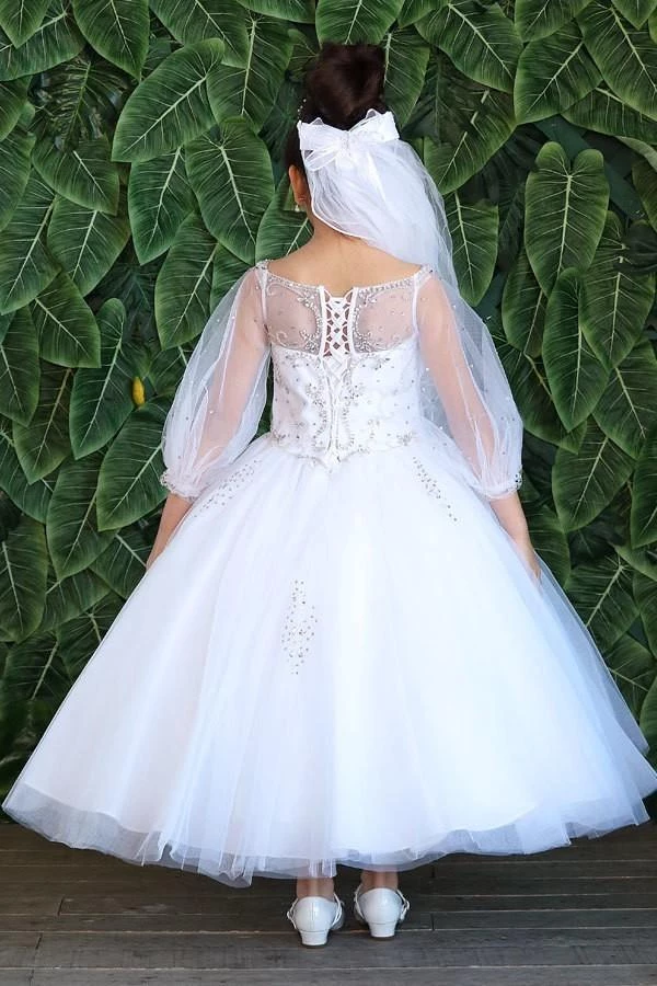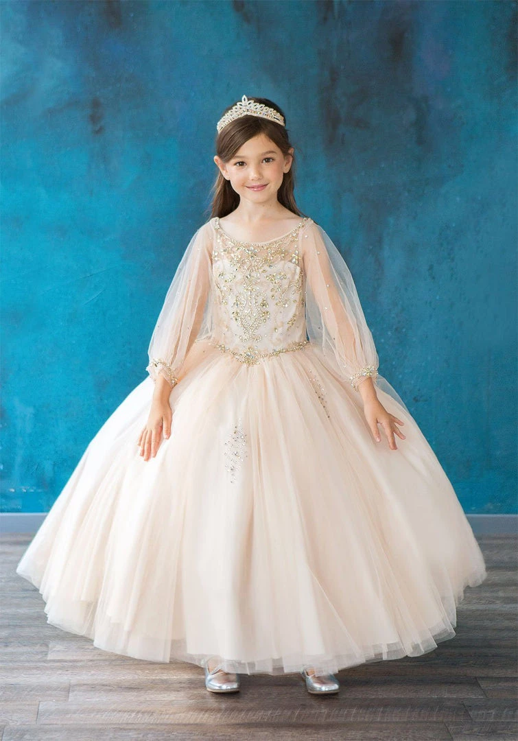 Your sweet girl will love twirling around in this beaded long pouf sleeve dress with A-line skirt by Calla Collection KY225. This beautiful ball gown features an illusion boat neck bodice adorned with sparkly beads, sheer long pouf sleeves, floor length A-line skirt, and a lace-up corset back. Available Matching Quinceanera Style KY71289.