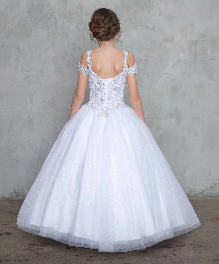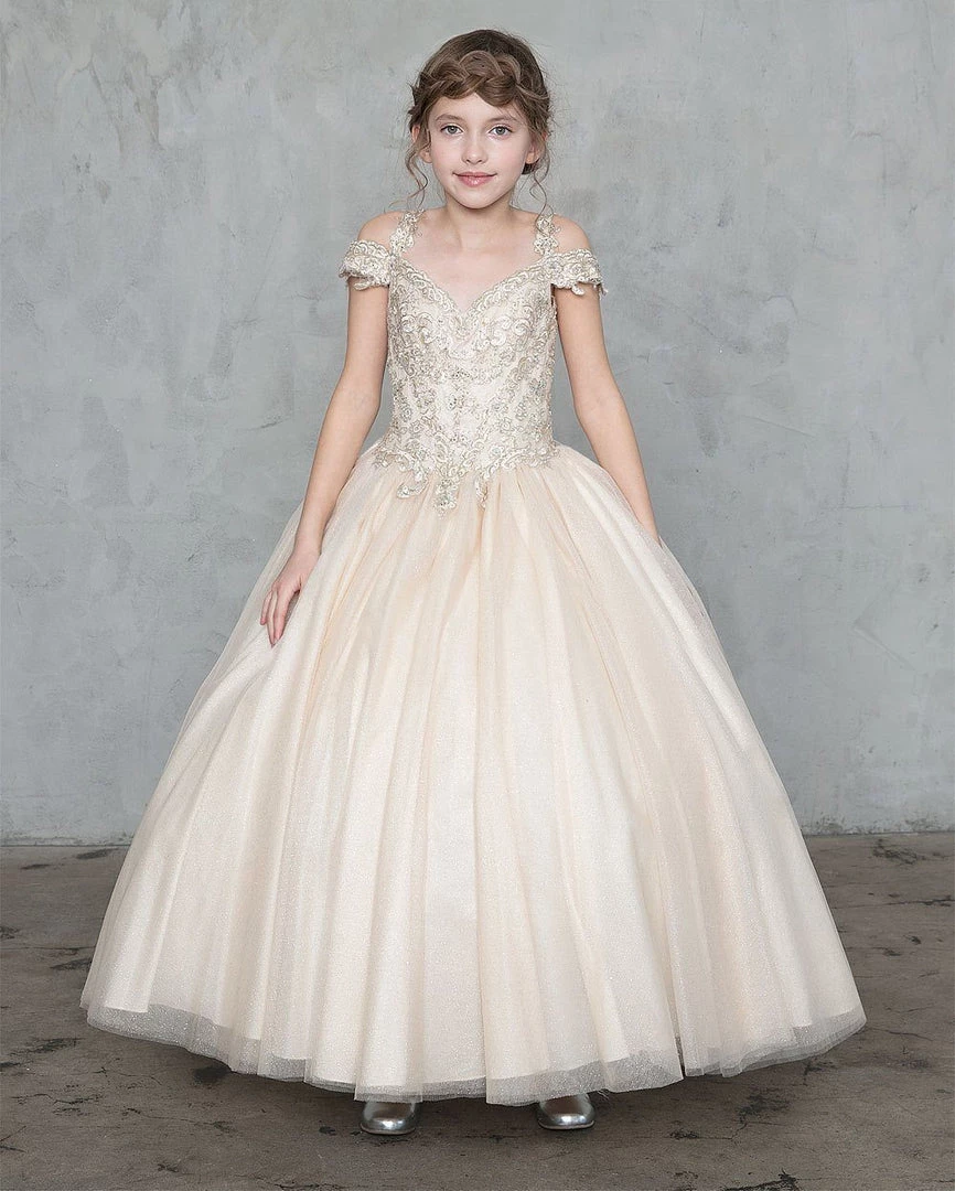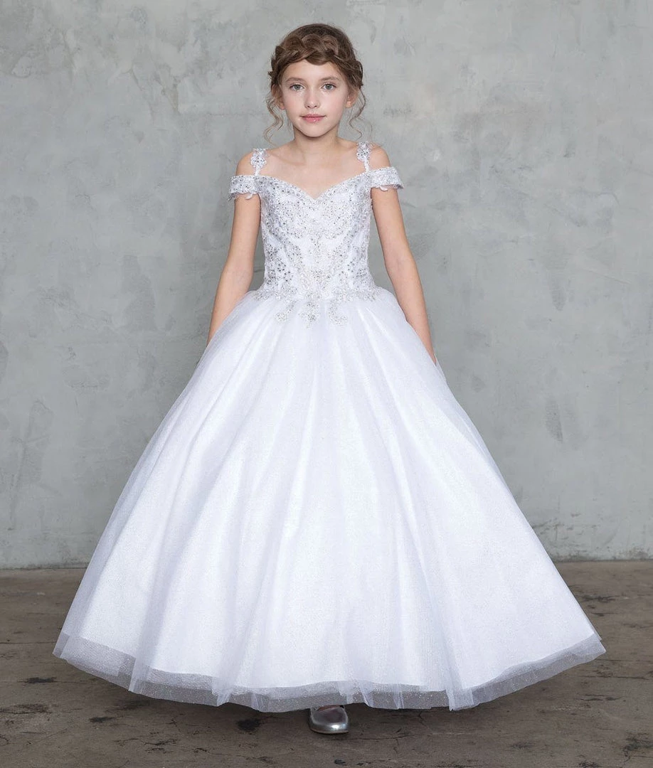 Your little girl will be the center of attention in this cold shoulder A-line ball gown with beaded top by Calla Collection KY208. This beautiful off the shoulder ball gown features a sweetheart bodice embellished with timeless embroidery accented with dainty beads, embellished short sleeves, embroidered shoulder straps for additional support, a modest open back, the floor length A-line skirt made out of glitter tulle will sparkle all throughout the night, and a lace-up corset back.