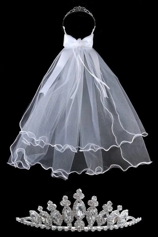 Your sweet girl will look timeless in this beautiful veil with attached silver clear rhinestone tiara. This double layered white First Communion veil features a sparkly and elegant crown in the front, satin bow on the back, and ruffled edges.
