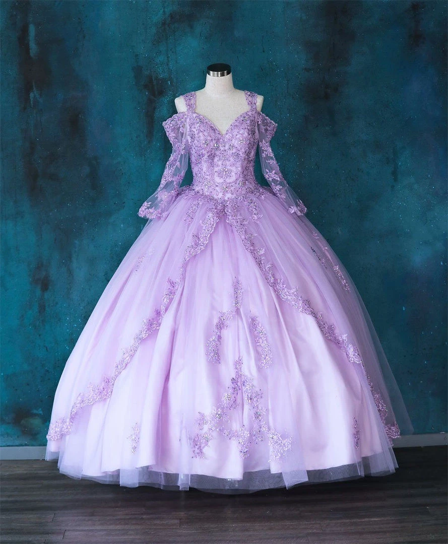 Your sweet girl will love twirling around in this lace appliqued long bell sleeve dress with A-line skirt by Calla Collection KY229. This beautiful ball gown features a sweetheart cold shoulder bodice adorned with beaded lace appliques, illusion long bell sleeves, partial open back, floor length A-line skirt with split front, and a lace-up corset back. Available Matching Quinceanera Style KY70029.