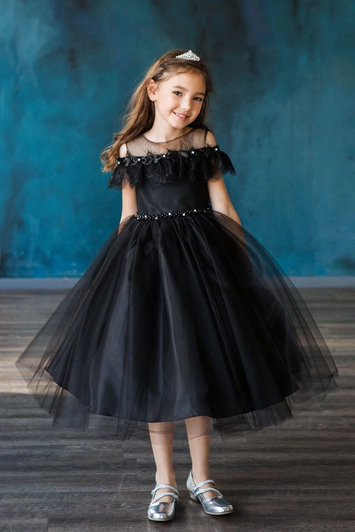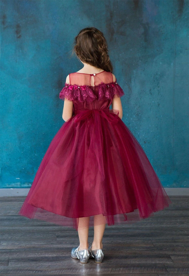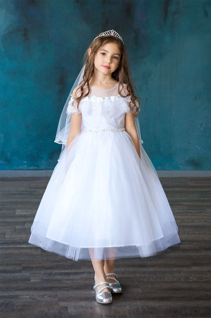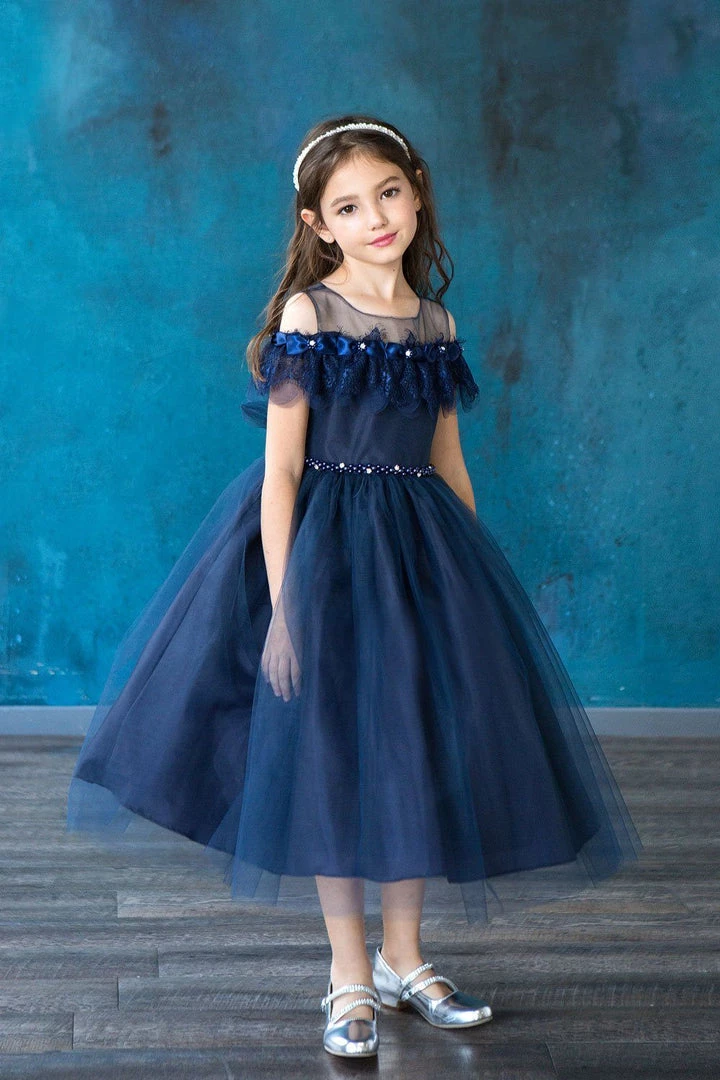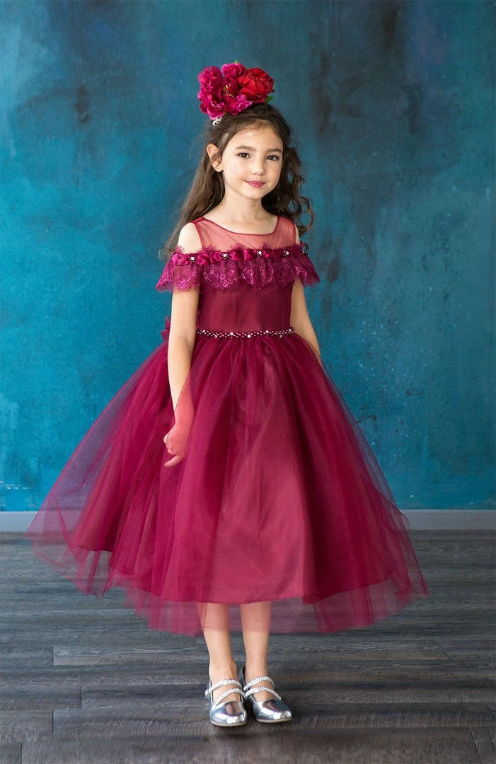 Your sweet girl will light up the room in this lace trimmed cold shoulder tulle dress with tea length A-line skirt by Calla Collection D798. This beautiful gown features an off shoulder sheer bodice adorned with lace trim, beaded waistband, tea length A-line tulle skirt, partial open back with bow sash, and a zipper closure.