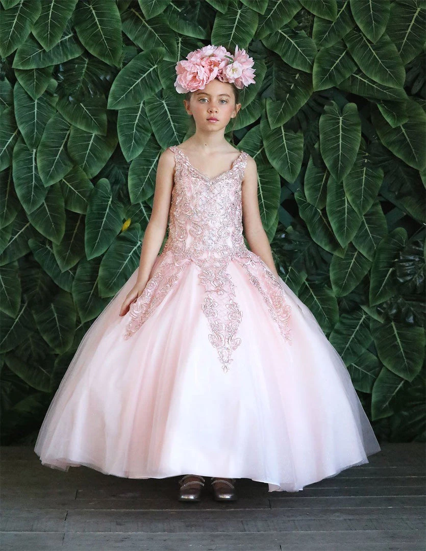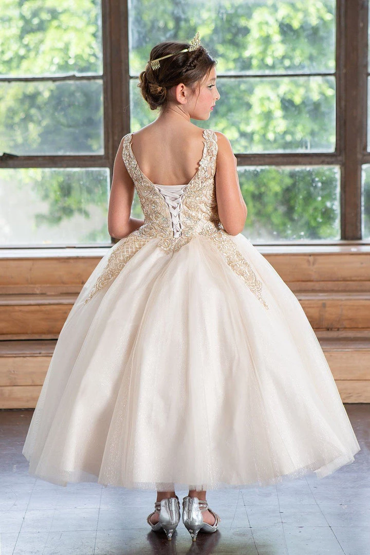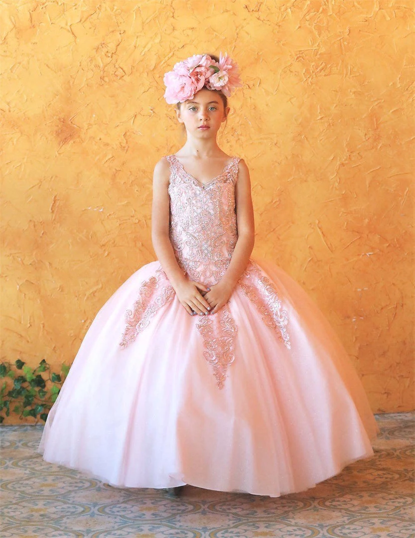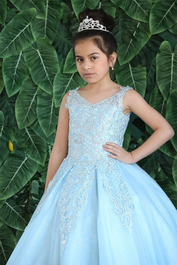 Your sweet girl will look picture-perfect in this long lace applique sleeveless dress with glitter skirt by Calla Collection KY221. This beautiful sleeveless ball gown features a V-neck bodice embroidered with beaded lace appliques, open back, a floor length A-line glitter tulle skirt, and a lace-up corset back. Available Matching Quinceanera Style KY79781X.