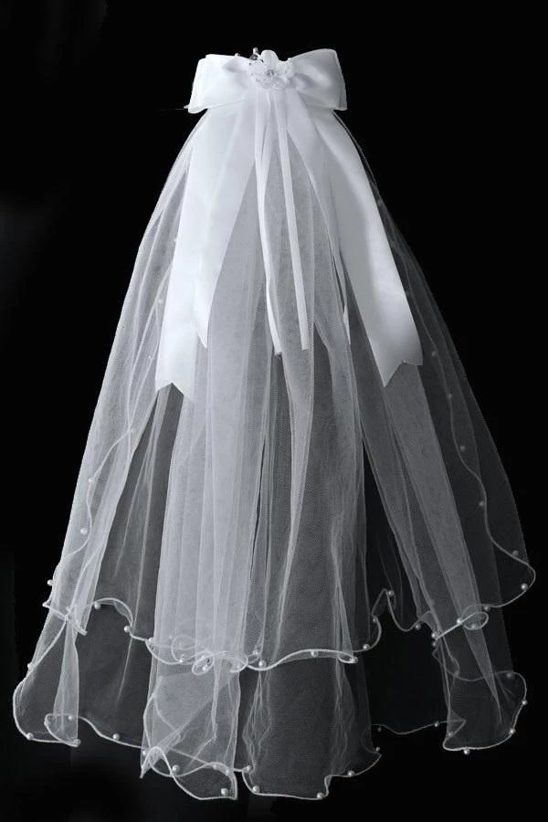 Your sweet girl will look timeless in this beautiful pearl beaded veil with attached silver clear rhinestone tiara. This double layered white First Communion veil features a sparkly and elegant crown in the front, satin bow on the back, peal beads, and ruffled edges.