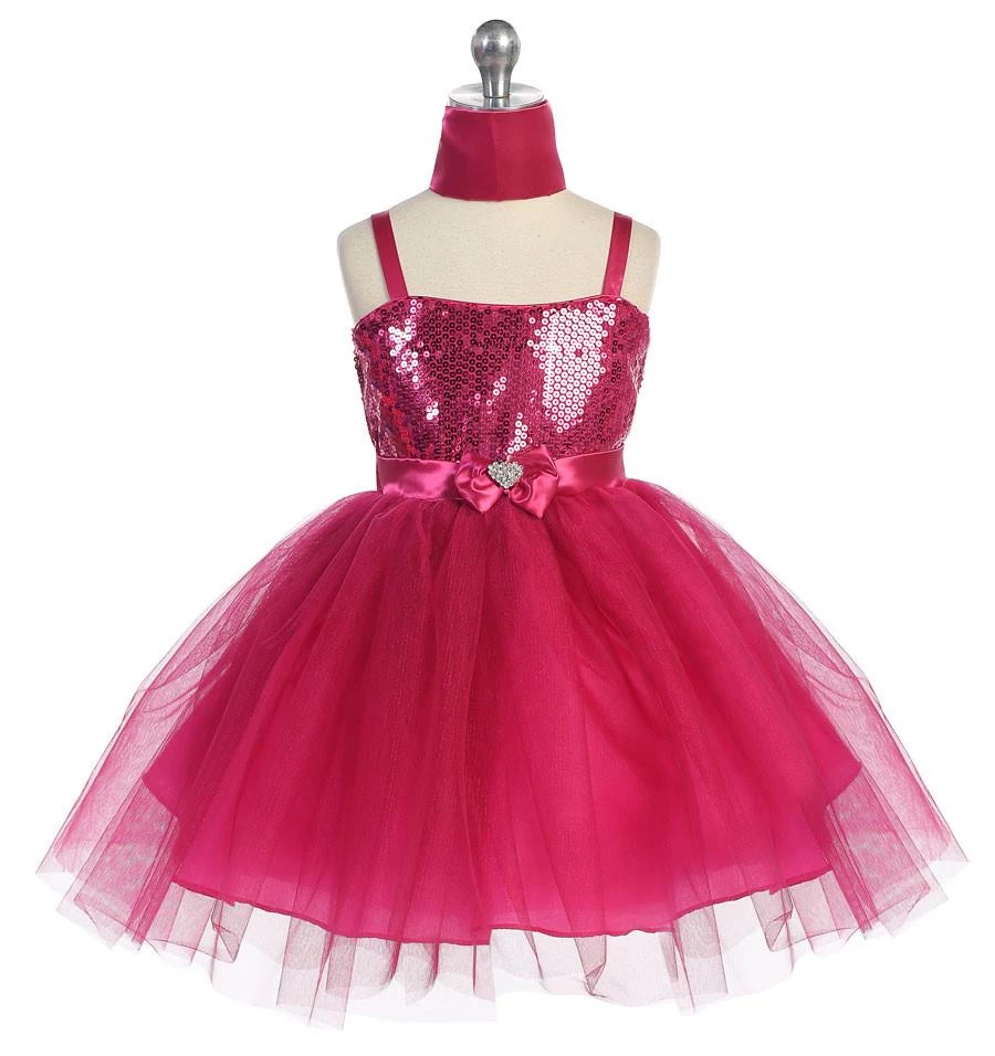 Your precious girl will dazzle the room in this short fuchsia dress with sequined sweetheart top for her pageant or at any formal event. Designed by Calla Collection, this A-line knee length dress features a spaghetti strap sweetheart bodice that is covered in sparkly sequins, satin waistband with a removable heart brooch, short taffeta skirt with a tulle overlay, and a zipper back closure with tie back sash. This short dress includes a matching shawl to complete the amazing look.