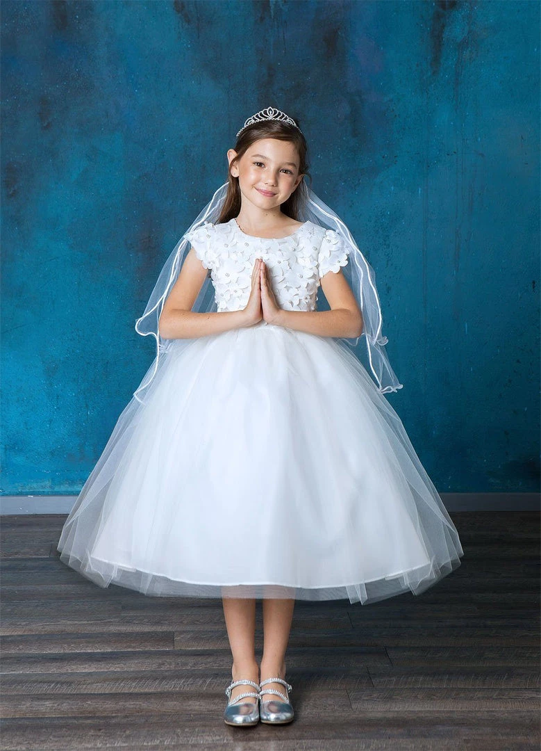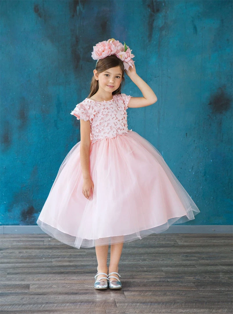 Your sweet girl will love twirling around in this 3D floral applique short-sleeved dress with tea length A-line skirt by Calla Collection D799. This beautiful gown features a short short sleeve bodice with pearl beaded flowers, tea length A-line tulle skirt, enclosed back with bow sash, and a zipper closure.