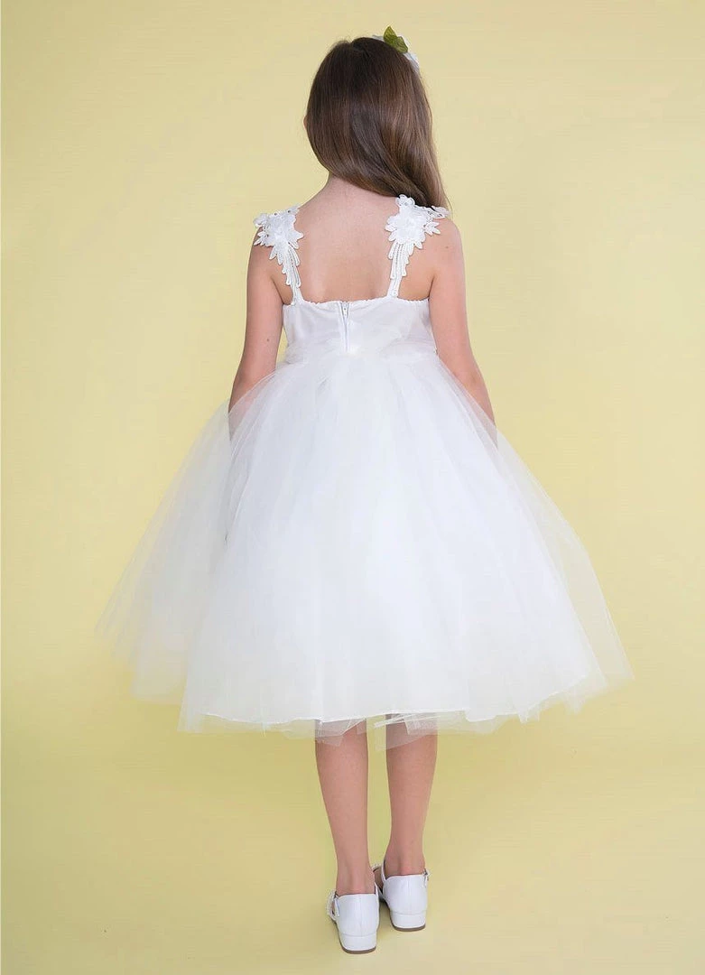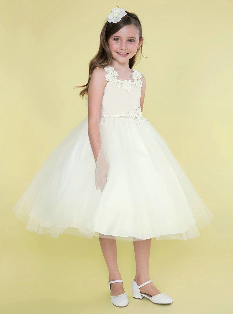 Your little girl will love dancing in this tea length dress with embroidered floral appliques. This beautiful sleeveless gown features a square neck bodice adorned with floral appliques accented with dainty beads, a thin beaded band defines the waist, the floral appliques on the shoulder straps look lovely, tea length tulle skirt, and a zipper back. She’ll love wearing this dress during her pageant, first communion, a wedding as the flower girl, or for any special occasion!