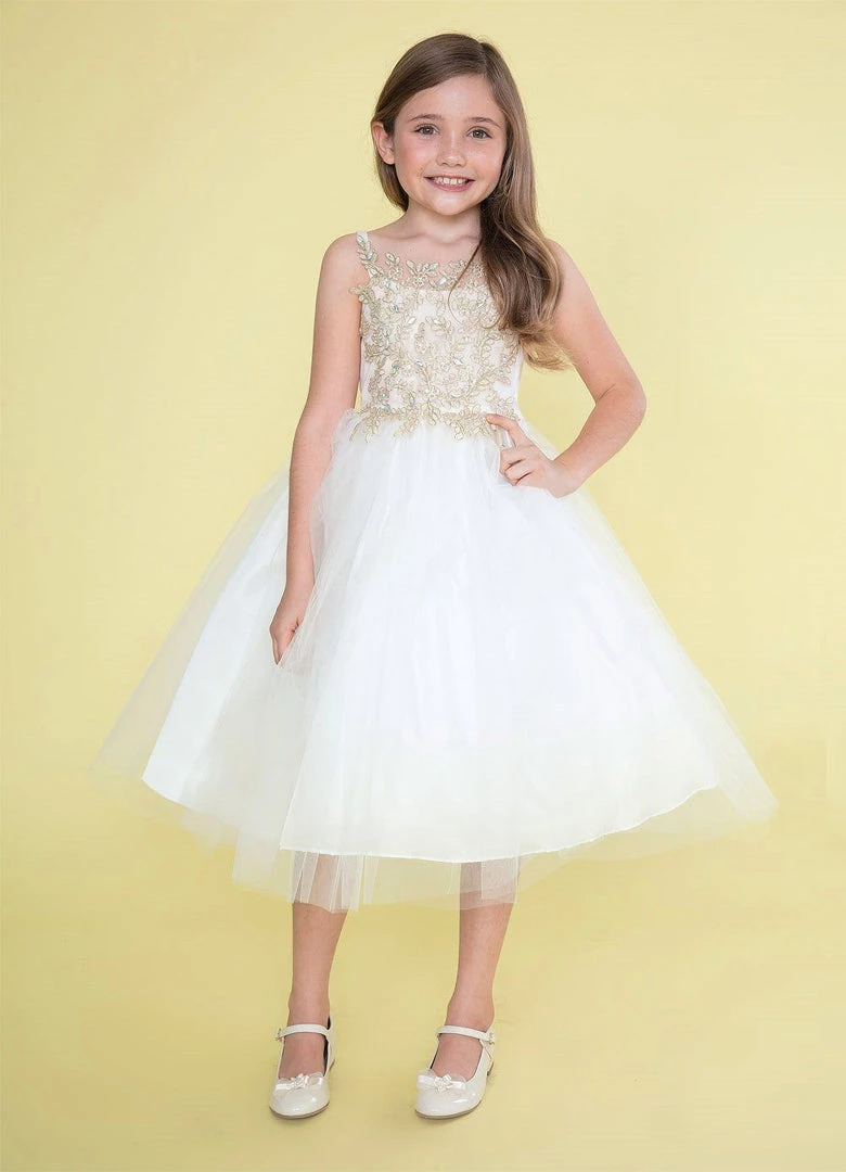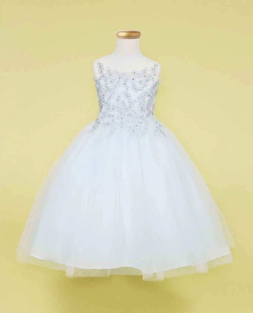 Your sweet girl is sure to make an entrance in this long sleeveless dress with leaf lace appliques by Calla Collection D778. This beautiful gown features a straight across bodice embellished with beaded vine floral appliques, full length tulle A-line skirt, open back with bow sash, and a zipper closure. Accessories pictured are NOT included.