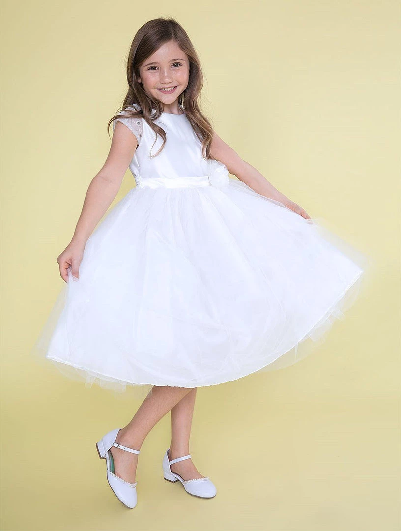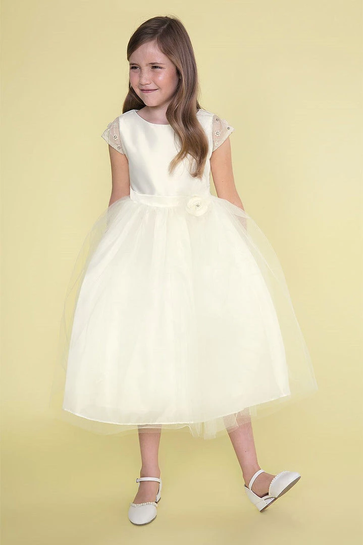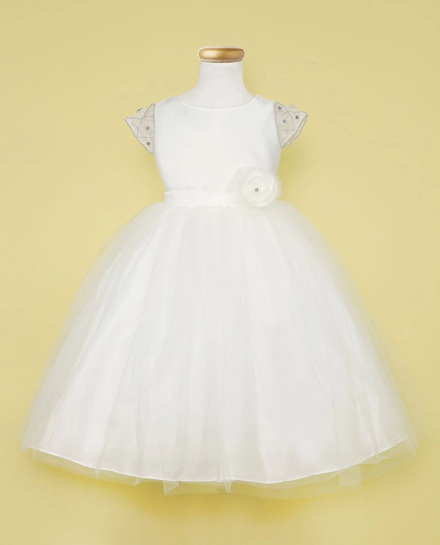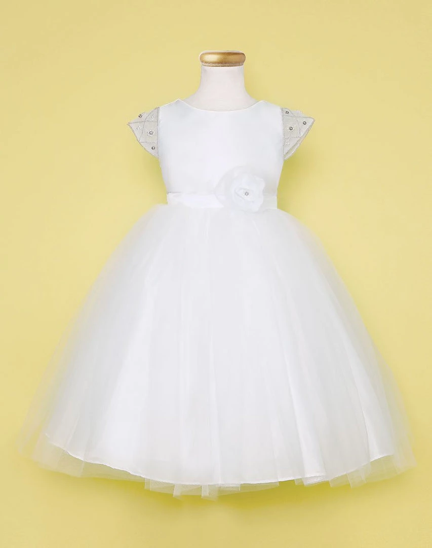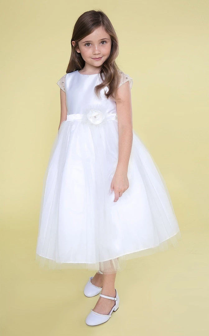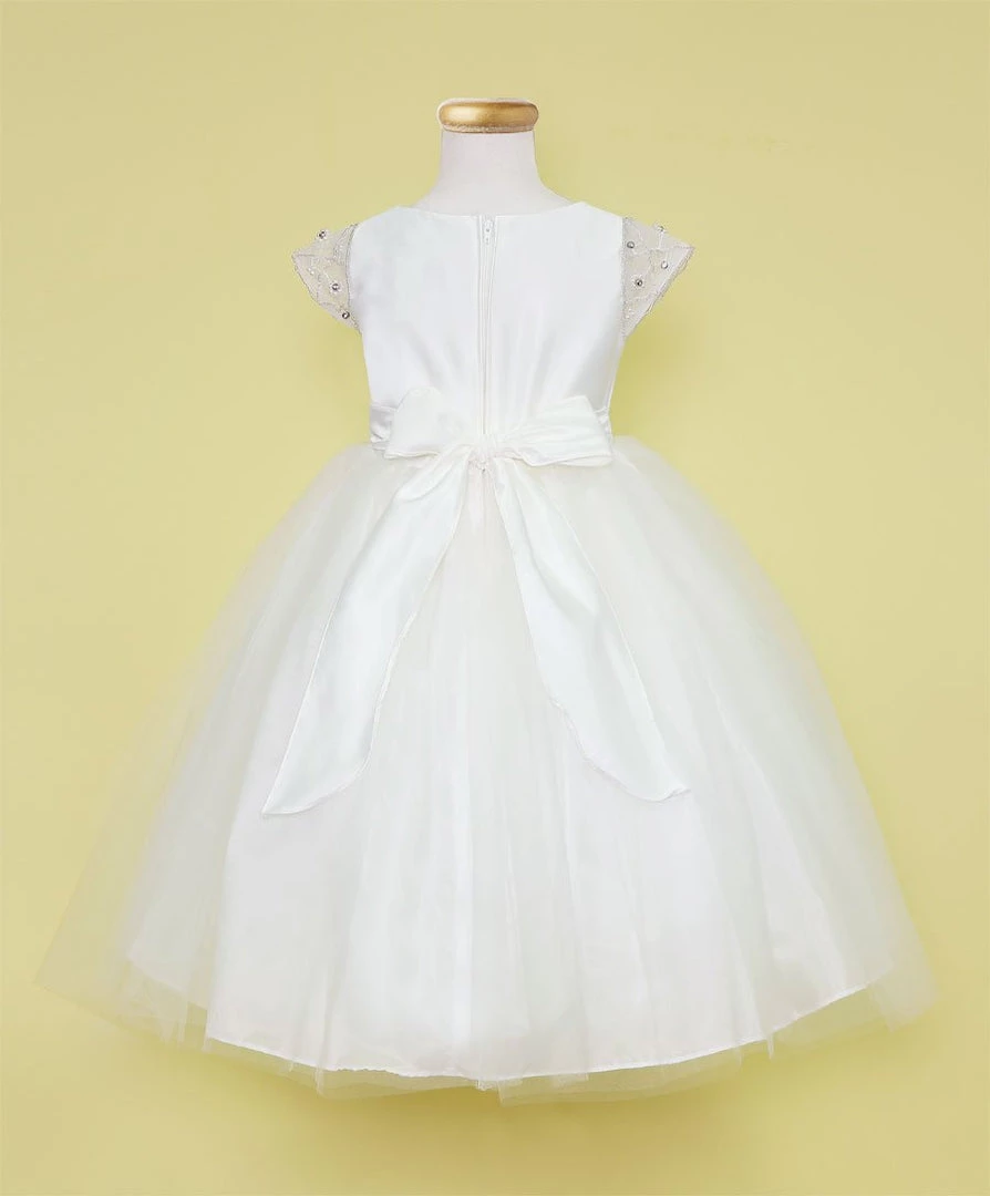 Your little girl will captivate the room in this tea length tulle dress with beaded short sleeves. This beautiful short-sleeved gown features a scoop neck bodice with sheer beaded short sleeves, a floral corsage adorns the waist, an enclosed back with tie sash, tea length tulle skirt, and a zipper back. She’ll love wearing this dress during her pageant, first communion, a wedding as the flower girl, or for any special occasion!