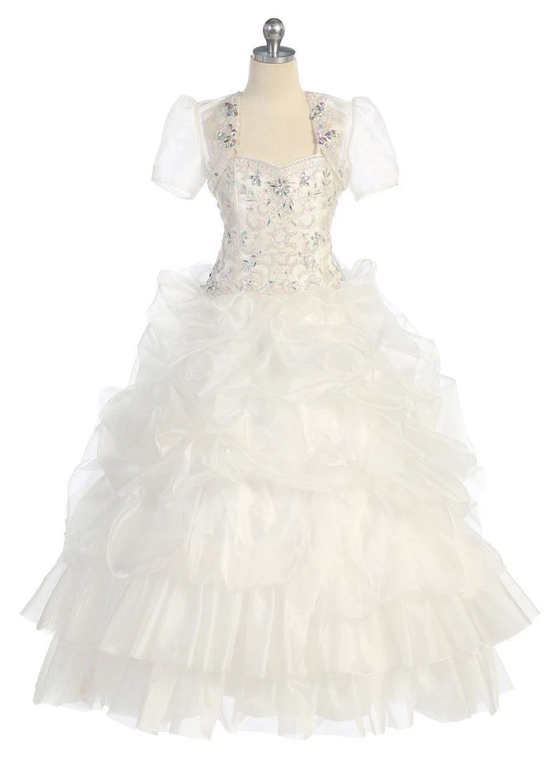 Your sweet girl will dazzle the room in this beaded long sleeveless dress with A-line pickup skirt by Calla Collection MC201. This beautiful ball gown features a sweetheart bodice adorned with sparkly beads, open back, floor length A-line skirt with pick-ups, and a lace-up corset back. Matching bolero jacket is included.