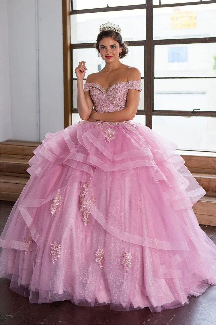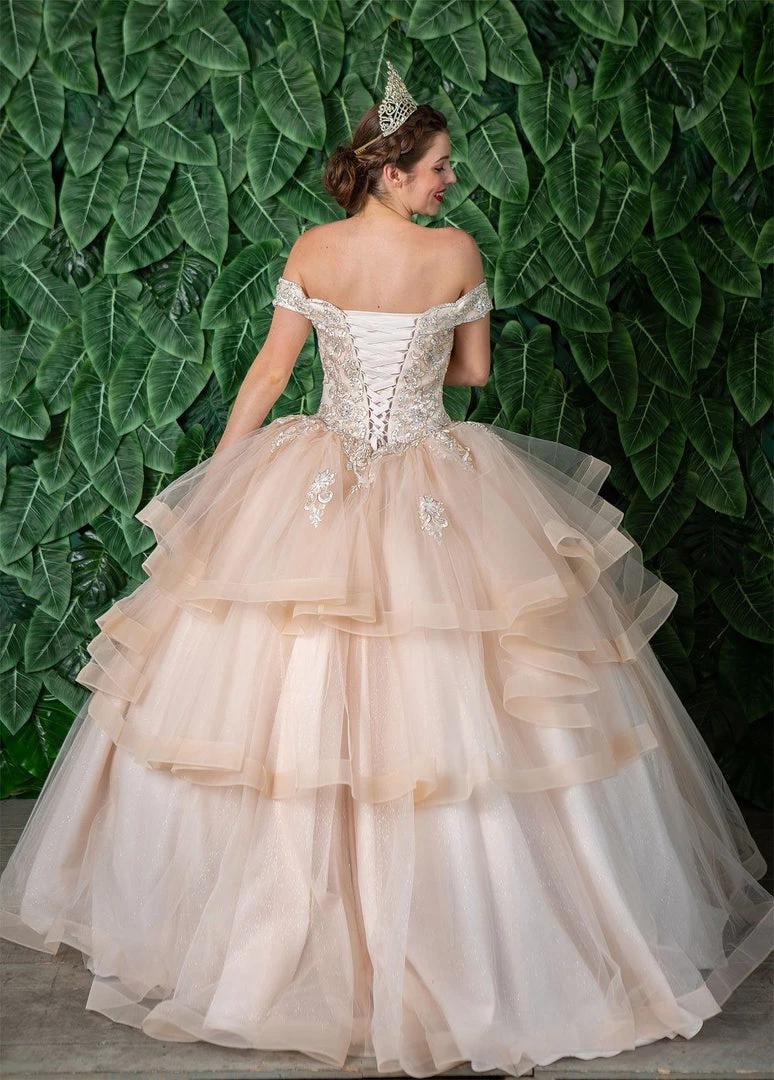 Light up the room in this embroidered long off the shoulder dress with A-line glitter skirt by Calla Collection KY018383X. This beautiful ball gown features a sweetheart off shoulder bodice adorned with beaded embroidery, floor length A-line layered skirt with lace appliques, and a lace-up corset back. Matching Mini Quince Style KY223.