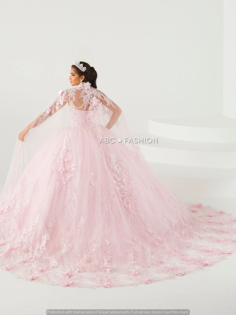 Fascinate all as you make your grand entrance in this gorgeous quinceanera dress. Sweet and charismatic, this ball gown features a subtle sweetheart strapless neckline with detachable cape and a royal train. Gleaming hand sewn bead work with lace bodice highlighting an impeccable embellishment. Made in a charming tulle with sparkle tulle underlay fabric. The voluminous skirt showcases delicate three-dimensional flowers that cascade illustrating an enchanting detailing that will mesmerize the crowd.