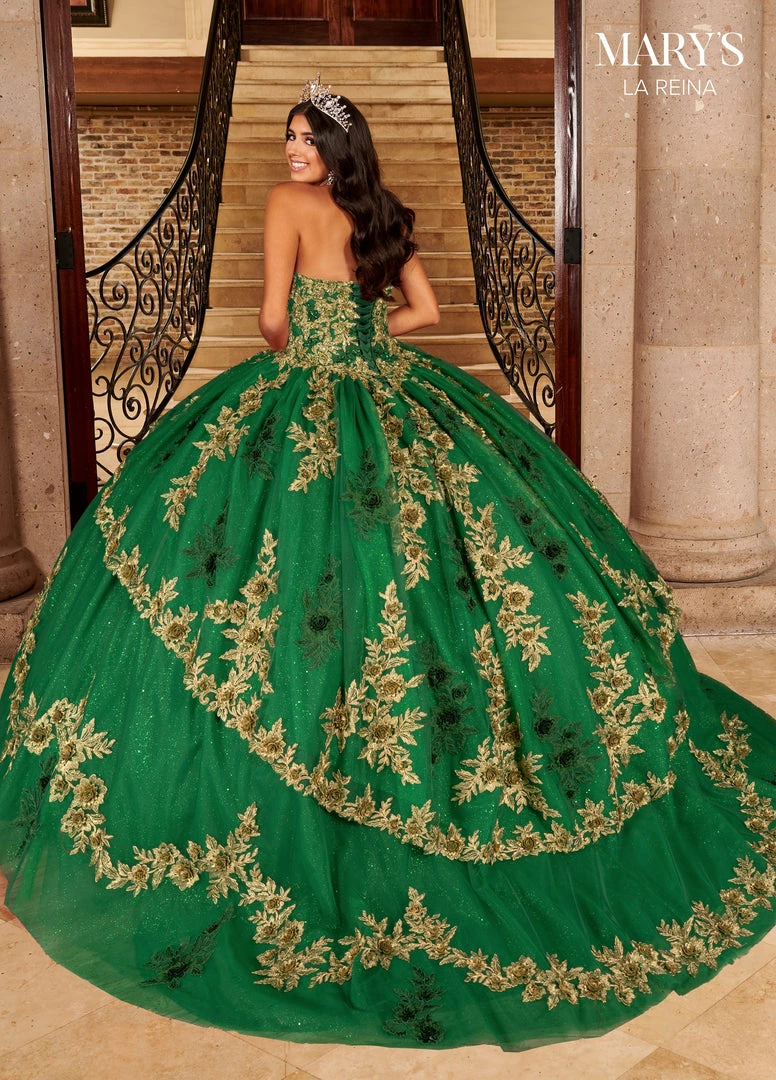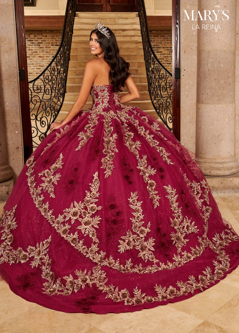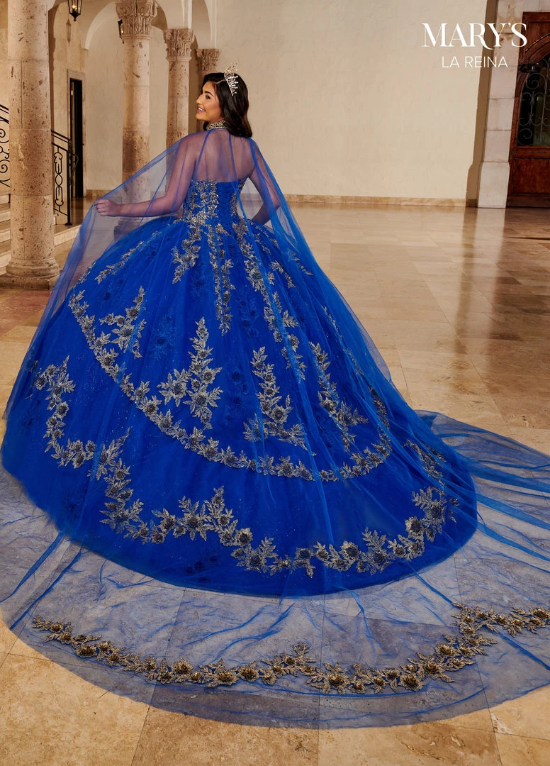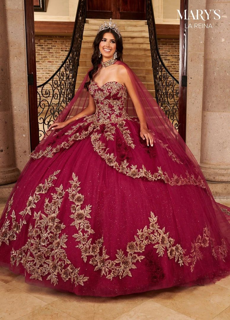 Look like a fairy-tale Princess in this beaded long strapless cape dress with A-line skirt by Mary’s Bridal Quinceanera MQ2149. This strapless glitter tulle quinceanera ball gown features a sweetheart neckline, lace appliques, beaded embellishments, 3D flowers, skirt overlay, royal length cape, lace-up back closure, and a matching bolero jacket.