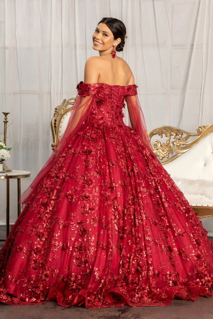 Dance the night away in this 3D floral applique long off the shoulder dress with A-line skirt by Elizabeth K GL1970. This dress features sweetheart neckline, corset back, and cut-away shoulder with airy mesh layer draped around your arms. Entire dress is decorated with 3-D floral appliques, glitter, and sequin embellishments.