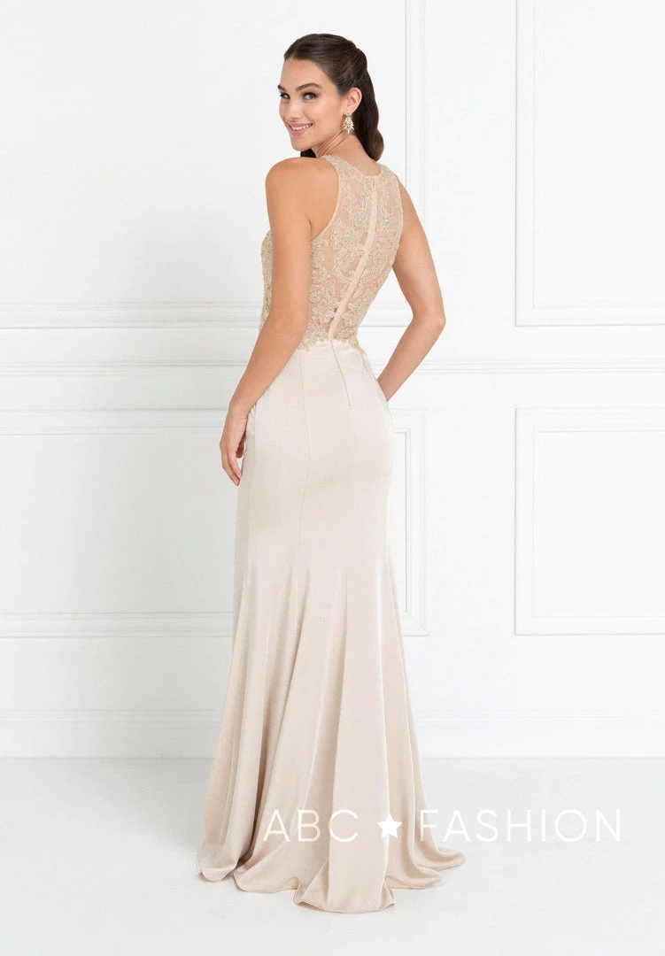Look and feel beautiful in this long champagne dress with bead embellished illusion bodice by Elizabeth K GL1568. Sleeveless high-neck full length dress on a mermaid silhouette. Sheer embroidered back with zipper close. Full front sequin embroidery detail with soft jewel placement on a solid one tone. Perfect for any formal event!
