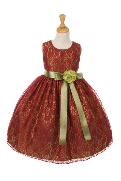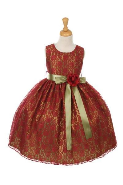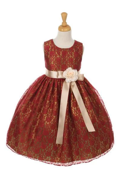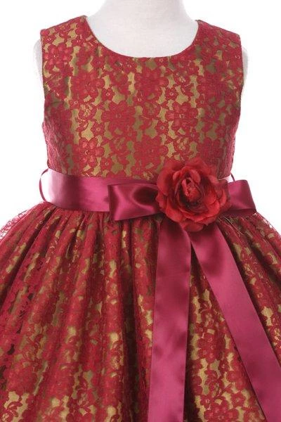 Your sweet girl will look lovely in this burgundy raschel lace tea length dress with floral sash by Cinderella Couture. Elegant lace tea-length dress with replaceable sash and flower corsage. A handy back zipper and a floral lace overlay adds effortless elegance.