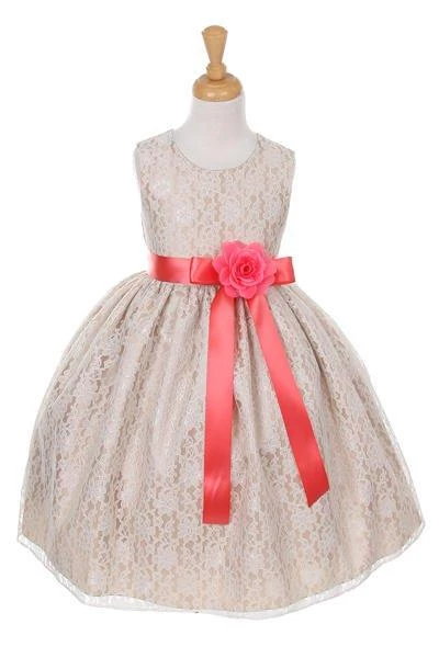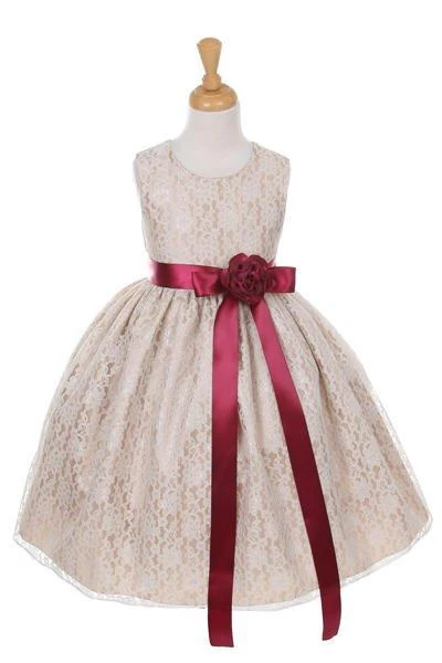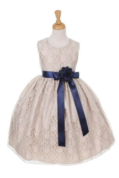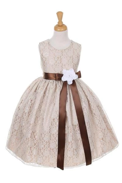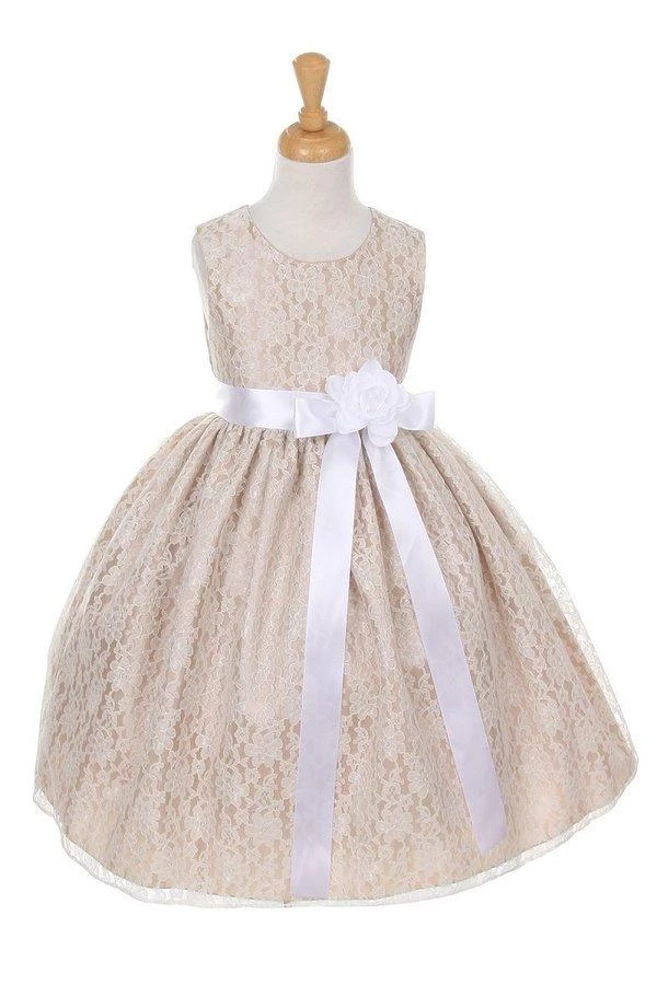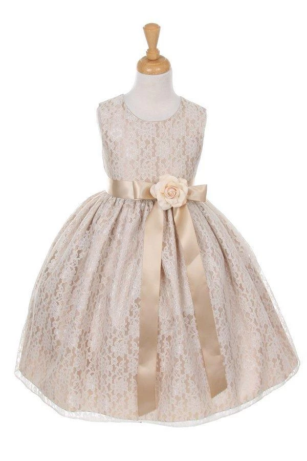 Your sweet girl will look lovely in this champagne raschel lace tea length dress with floral sash by Cinderella Couture. Elegant lace tea-length dress with replaceable sash and flower corsage. A handy back zipper and a floral lace overlay adds effortless elegance.