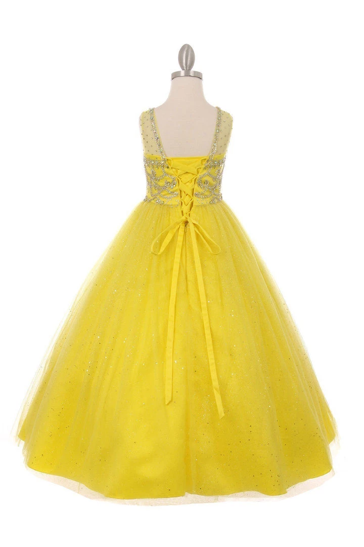 Your little girl will be the center of attention in this ball gown! Your precious girl will look lovely in this sparkly hand beaded rhinestone illusion dress. This sleeveless floor length gown features a beautiful sleeveless round illusion neckline bodice that is adorned with AB tone crystal beading, a fully gathered A-line skirt drops in full to the floor length in layers of glitter tulle fabric, and an adjustable lace-up corset back with an invisible zipper.