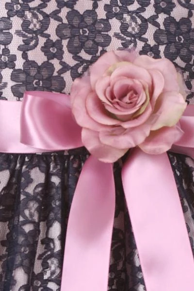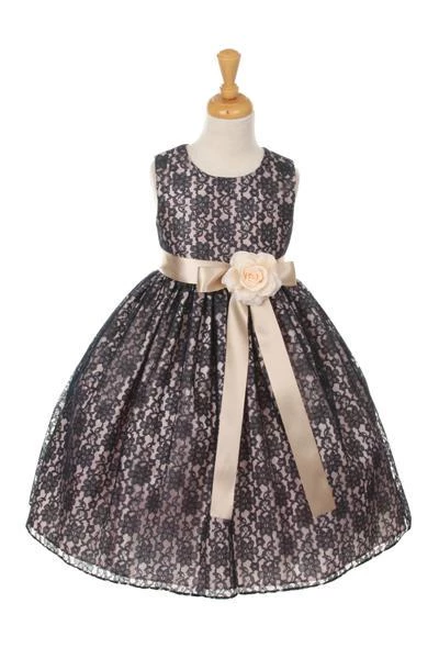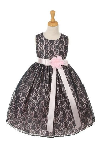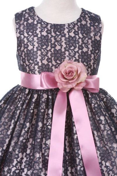 Your sweet girl will look lovely in this navy blue raschel lace tea length dress with floral sash by Cinderella Couture. Elegant lace tea-length dress with replaceable sash and flower corsage. A handy back zipper and a floral lace overlay adds effortless elegance.