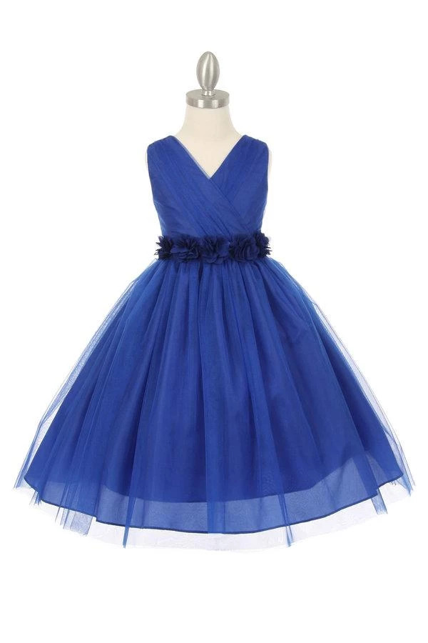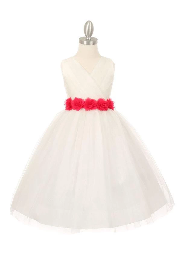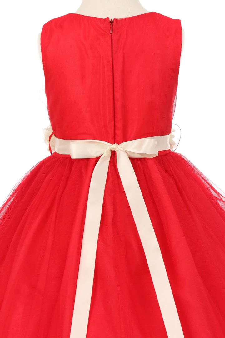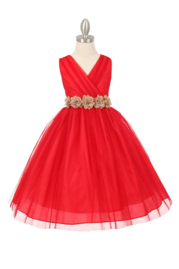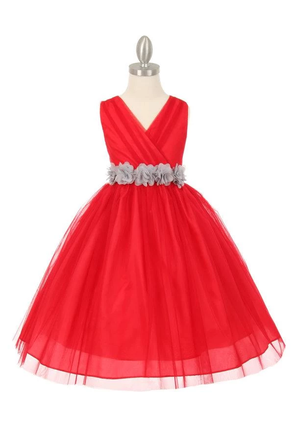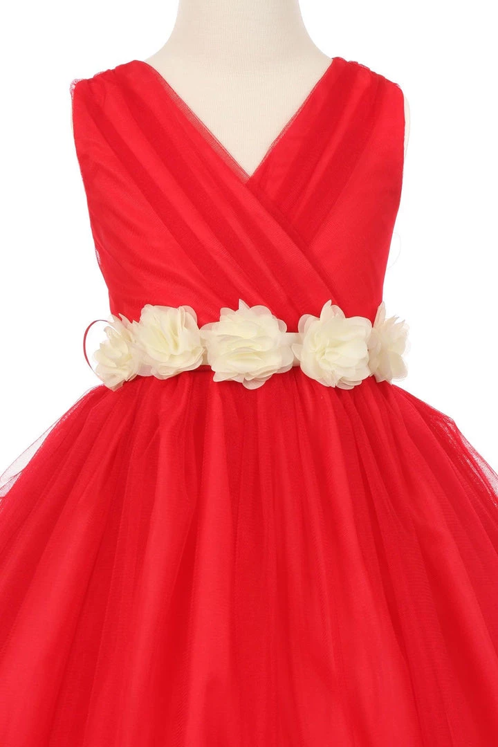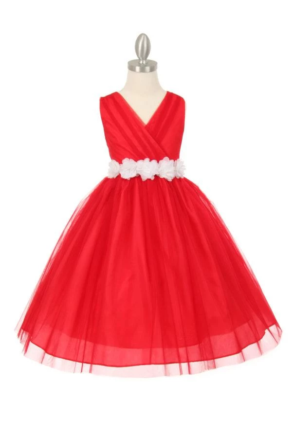 Your sweet girl will receive lots of compliments in this red pleated V-neck tea length dress with flower sash by Cinderella Couture. This shiny tulle dress features a sleeveless pleated V-neck bodice, chiffon flower satin ribbon sash, enclosed back, tea length A-line skirt, and a zipper closure.