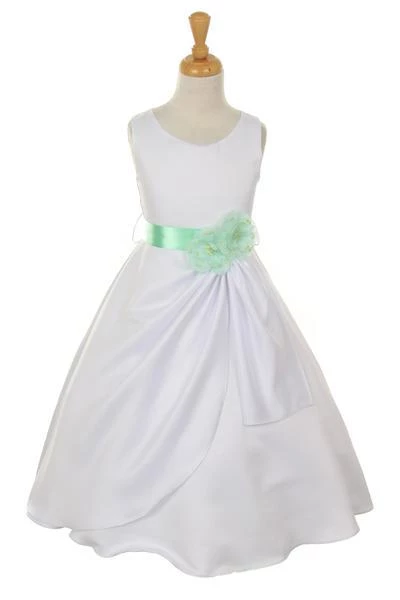 Your girl will look picture-ready in this sleeveless matte satin white dress with sequined mint flowers and ribbon sash. Perfect as a flower girl dress or for any special occasion!