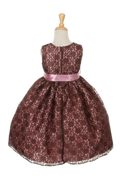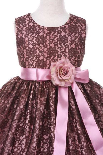 Your sweet girl will look lovely in this brown raschel lace tea length dress with floral sash by Cinderella Couture. Elegant lace tea-length dress with replaceable sash and flower corsage. A handy back zipper and a floral lace overlay adds effortless elegance.