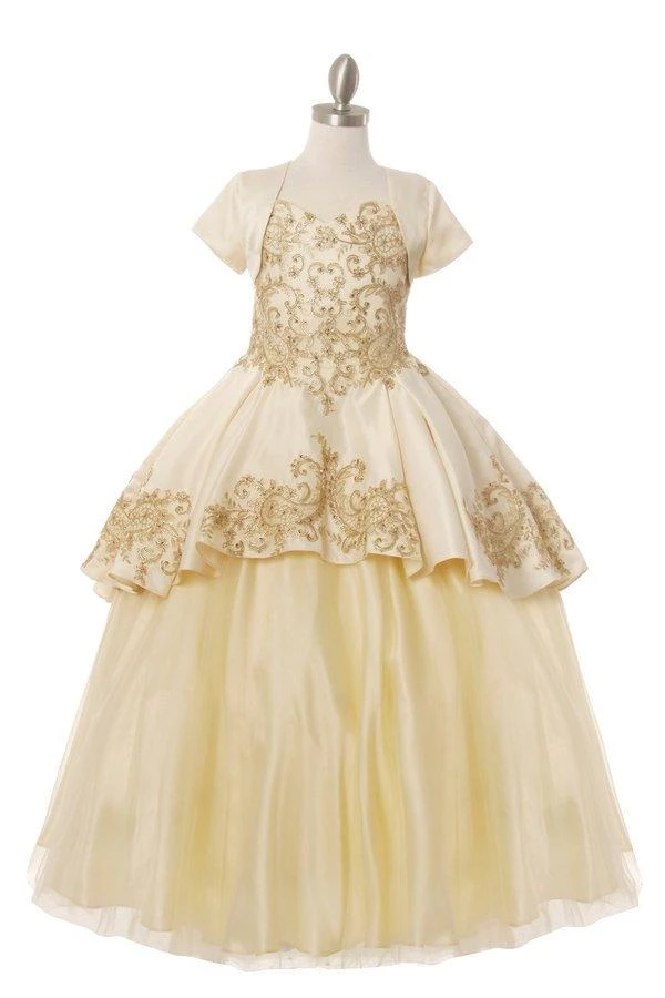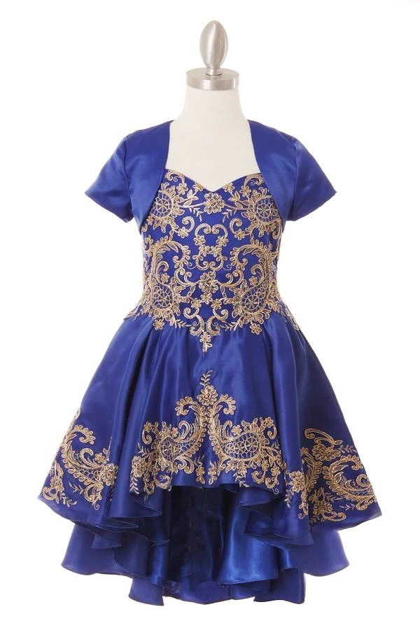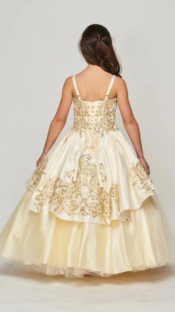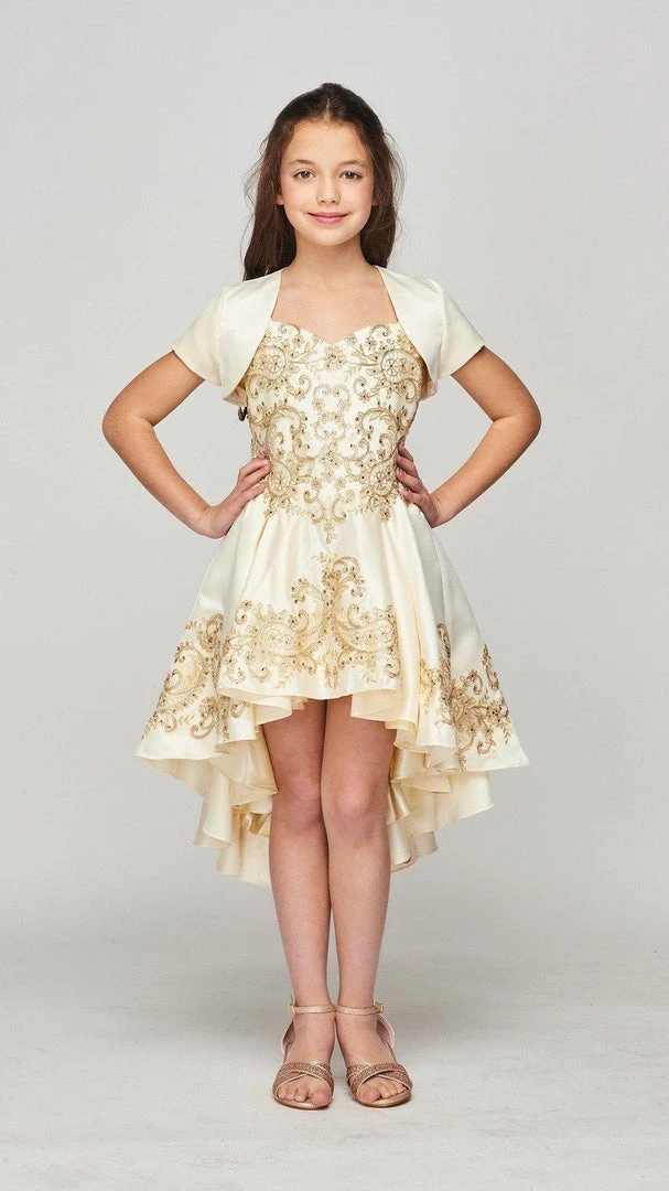 Your sweet girl will receive lots of compliments in this long gold embroidered dress with detachable skirt. This breathtaking 3-piece long sleeveless dress features a spaghetti strap bodice adorned with gold lace appliques, a sweetheart neckline, and a lace up back closure. A matching bolero jack and removable A-line skirt are included with this gown. Under the long skirt reveals a lovely high low short dress – perfect for a gorgeous second look!