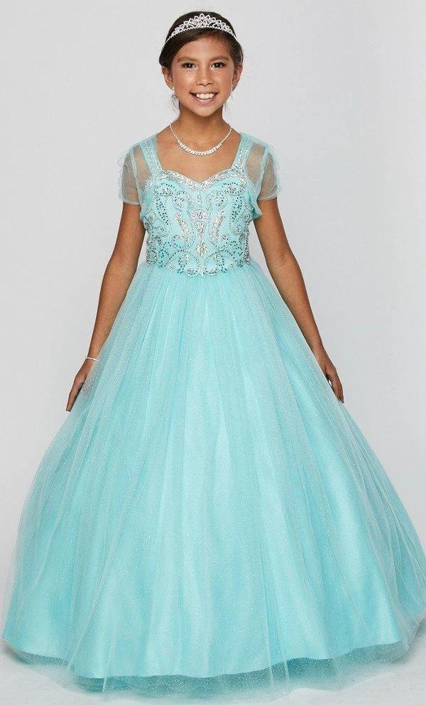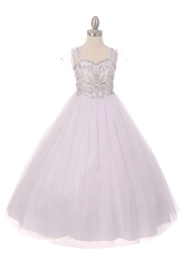 Your little girl will love twirling around in this ball gown! Your precious girl will look lovely in this sparkly hand beaded rhinestones two-piece dress. This sleeveless floor length gown features 1/2″ spaghetti shoulder straps, beaded embroidery with AB color rhinestones, adjustable straps for better fitting and comfort, and a lace-up corset back. Additional netting is underneath the A-line skirt giving it a fuller look. A matching bolero jacket is included. Perfect as a girl’s pageant dress, 3 anos presentation dress, or for any special occasion!